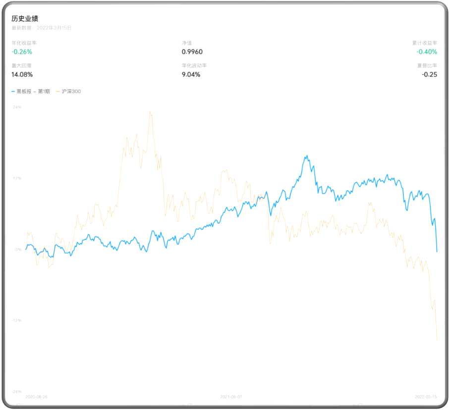 3 月 15 日跌得最惨的那天,黑板报第 1 期净值跌到了 1 元以下,这意味着,这次下跌把之前累计的收益全部吞噬了。尽管我们相比沪深300、相比其他偏股型产品,今年还算抗跌,但股票仓位已经有七成了,如果股市跌得很惨的话,我们的回撤也不可避免。