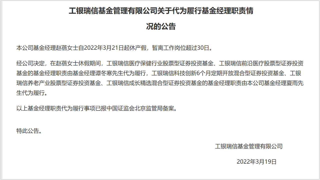 最后来说一下工银瑞信前沿医疗的情况,3 月 19 日工银瑞信发了一则公告,基金经理赵蓓要去休产假,我们黑板报中选择的工银瑞信前沿医疗由谭冬寒代为管理。