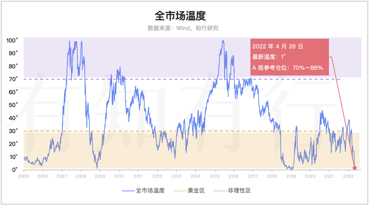 现在全市场温度到了什么程度呢?我们最新的全市场温度跌到了 1°。如果按照四季来看我们的温度变化,那么现在绝对属于寒冬。