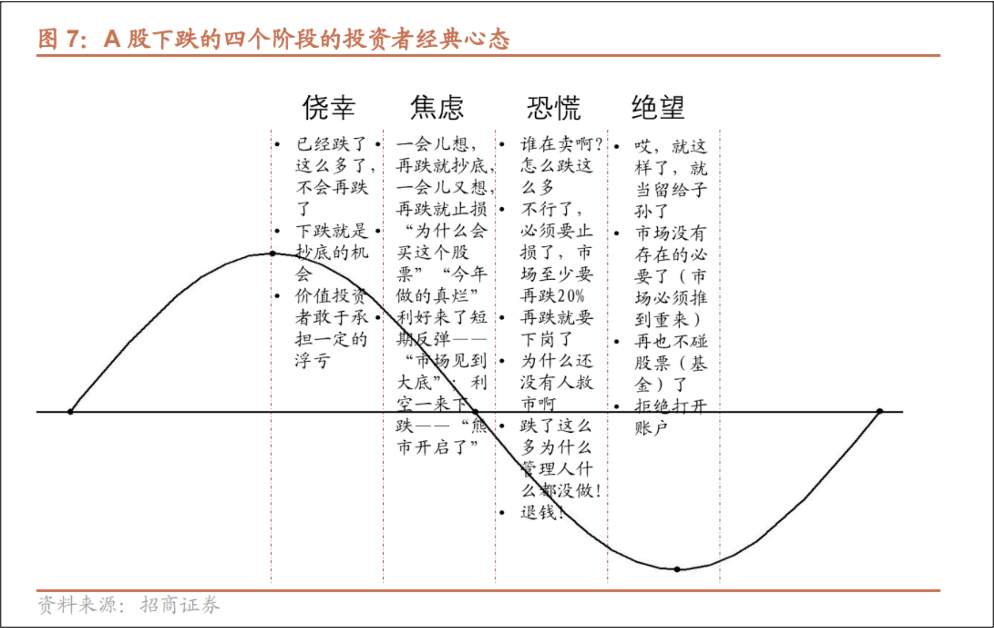 面对熊市下跌,投资者会经历各种心态的考验。下图是招商证券整理的,A股下跌时投资者心态变化的四个阶段。看,可能对于新手来看,是第一次体验熊市的过程,但对于投资时间很长的人来说,熊市下跌也没什么大不了的,很多现象早就被总结出来了。