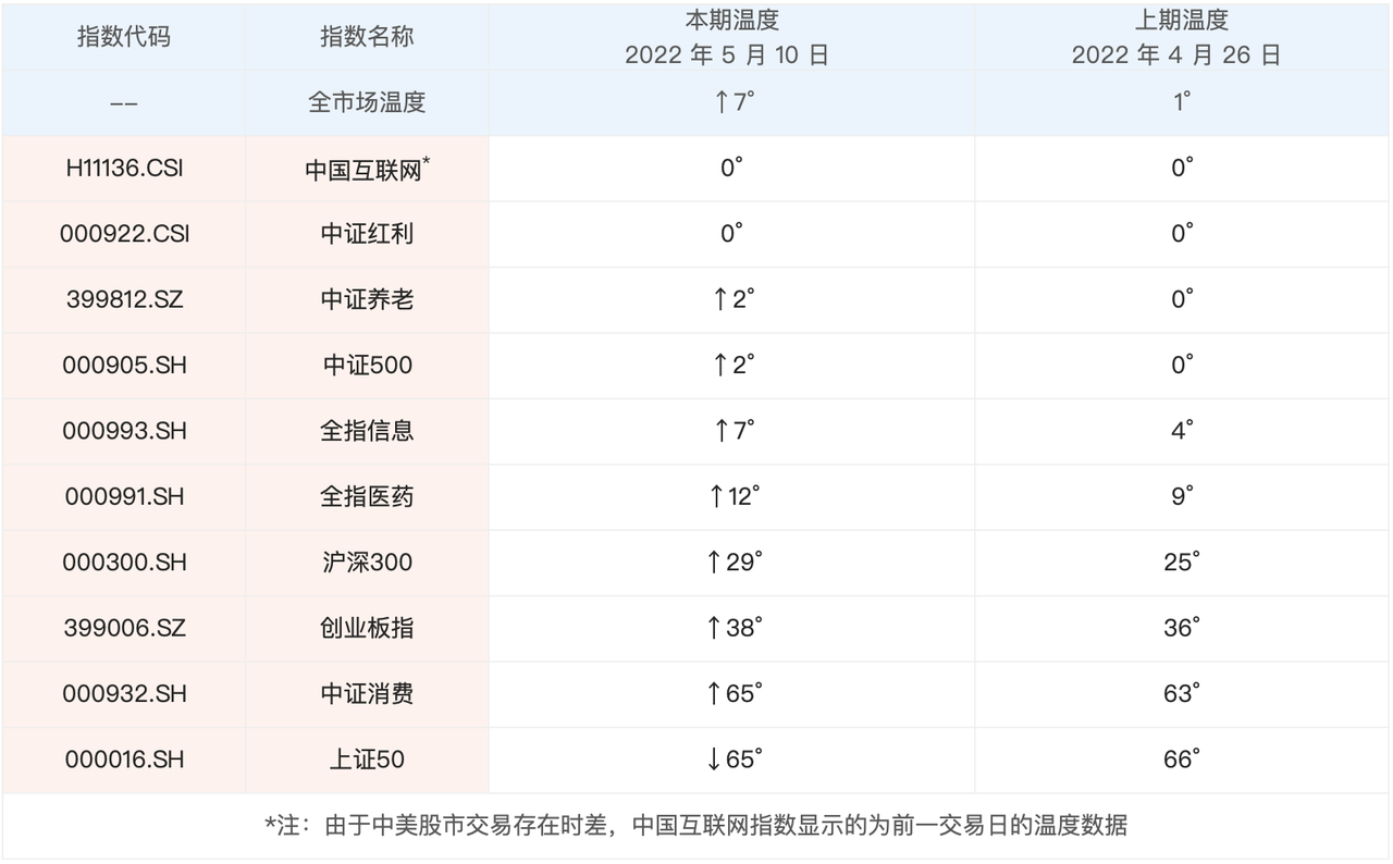最新的全市场温度涨到了 7°,具体指数方面,跟 4 月 26 日相比,黑板报里多数指数温度出现了上涨。但低估的指数还是那些,没有发生任何变化。结合全市场温度和每一期黑板报的情况,本期不发车。