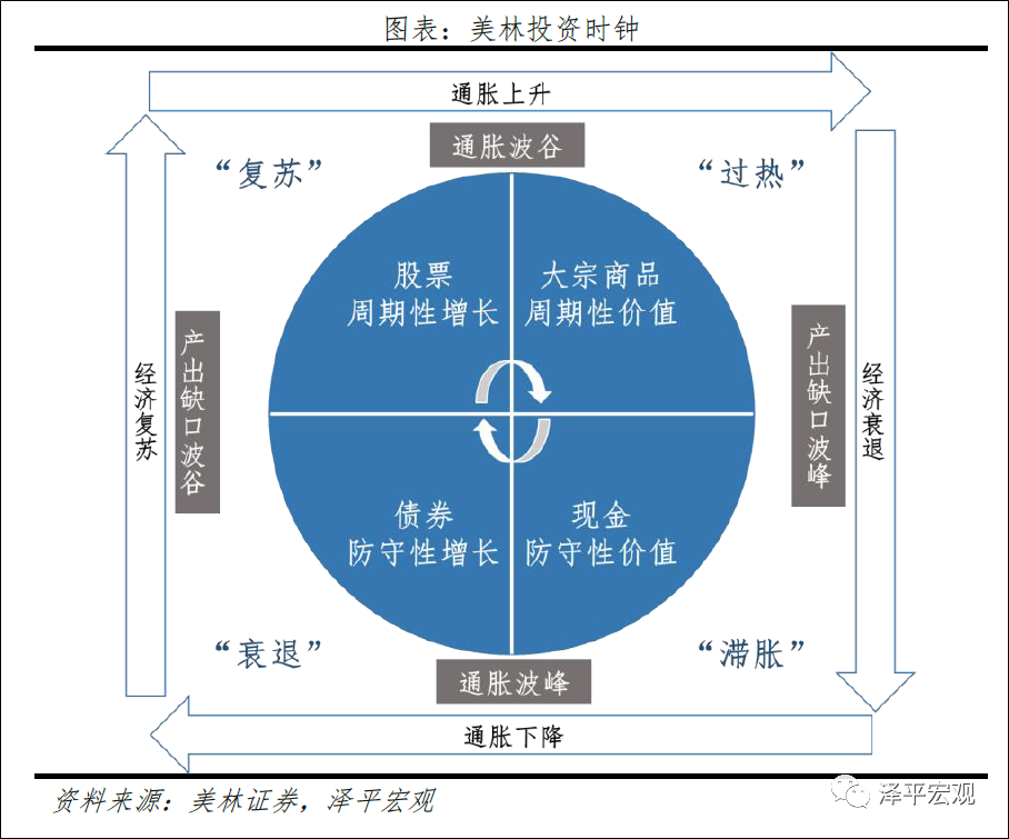 还有一类指标是在大类资产之间进行对比,例如大家都知道的美林时钟,给出了不同的经济环境下,哪类资产的性价比更高,它的优势在于清晰明了,难度在于对经济周期的判断太难了。