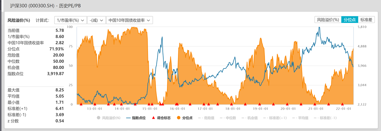 我们上面介绍了,风险溢价的数值越高,股票的性价比越高。那么沪深300当前跟债券的风险溢价,在过去 10 年处于 71.93% 的很高的位置,就说明沪深300当前已经具备了一定的性价比。