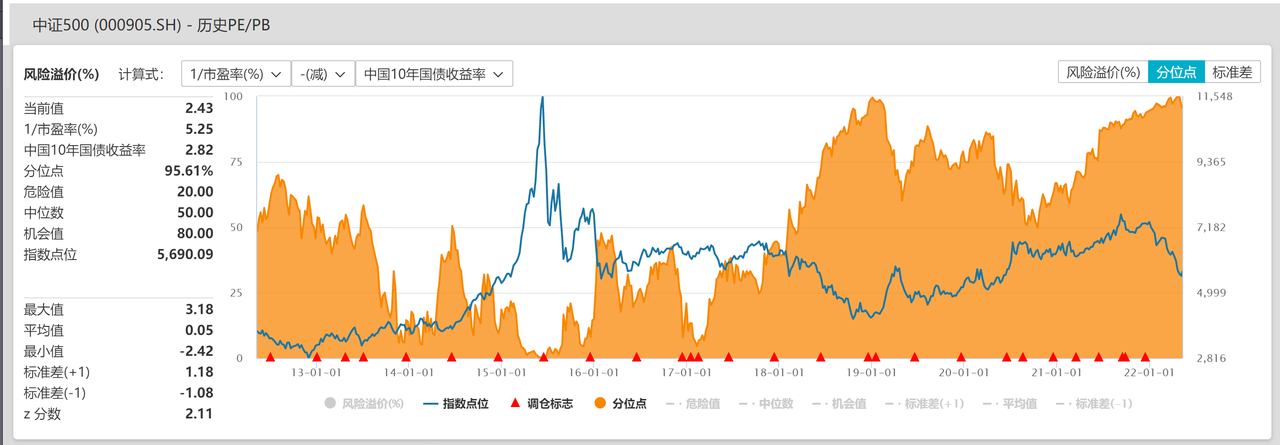 中证500和沪深300相比,风险溢价的分位数更高,处于 95.61%,性价比会更高。这跟我们的温度计也能对应上。