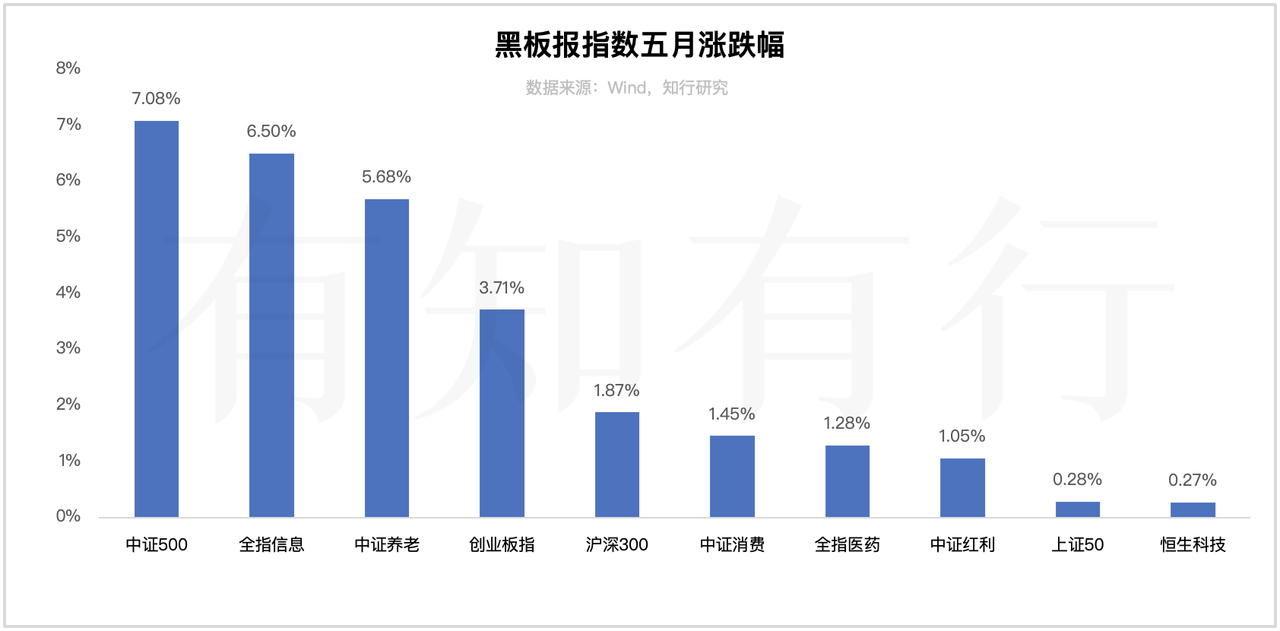 黑板报关注的指数里,除了中国互联网这个月的数据还没出全之外,其他指数也都出现了上涨。中证500在这里面反弹幅度最大,5 月上涨 7.08%。全指信息和中证养老涨得也不错。恒生科技和上证50,相对来说,涨幅较小。
