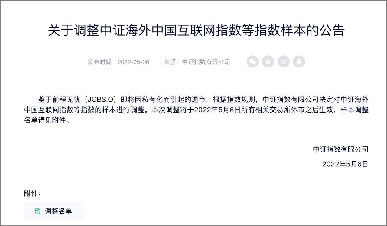 下图是前程无忧退市时,指数发布的公告,大家可以看一下。
