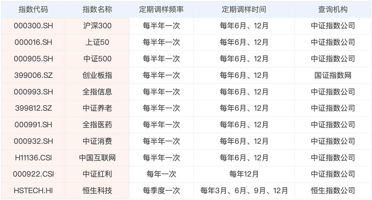 为了更好地反映当前的市场情况,沪深300会选择定期调整样本股,采用一年两次的频率,在每年的 6 月和 12 月进行调整。除此之外,如果有特殊事件发生,例如有新股上市,或者现有的样本股所在公司出现收购合并、分立、停牌、退市、破产、被实施风险警示等,沪深300也会进行临时调整。