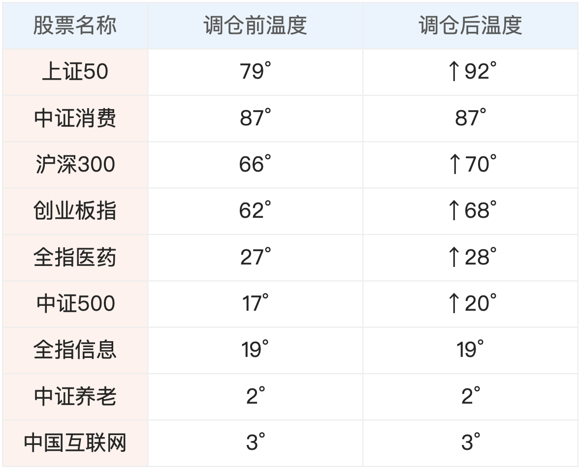 上面具体指数的温度图里,有些指数的温度变化跟它最近一周的涨跌幅对不上,例如上证50最近一周上涨 0.42%,指数温度却从 77° 涨到了 92°,沪深300最近一周跌了 0.02%,指数温度从 66° 涨到了 69°。为什么会出现不一致,主要是原因是这些指数在 6 月份调整样本股了,导致了指数估值的变化。