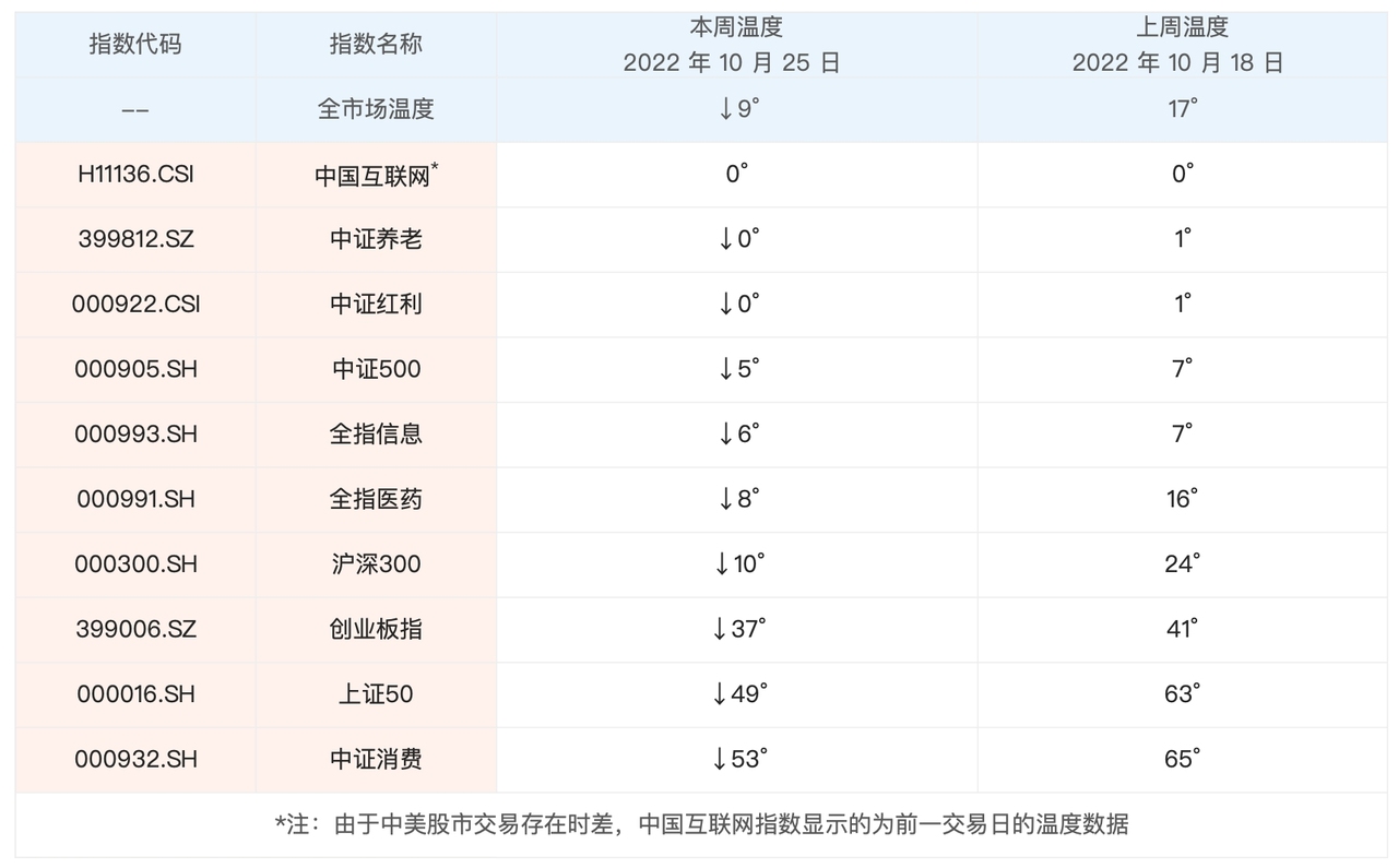 最近一周宽基指数和行业指数的变化,在我们的全市场温度和具体指数的温度上也能很清楚地体现出来。