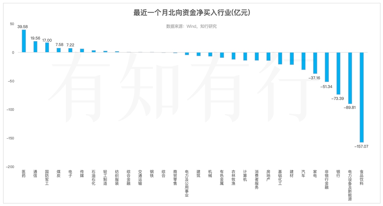 我们来看一下,最近一个月北向资金在每个行业上的买卖情况。从行业的视角来看,在大部分行业上,外资都是卖出大于买入。实现净买入的行业数量很少,排在前面的是医药、通信和国防军工。外资净卖出的行业里,以贵州茅台为代表的食品饮料行业卖出最多,截止到周一,最近一个月净卖出 157 亿元,除此之外,电力设备及新能源、银行、非银行金融等行业,外资净卖出的资金也不低。