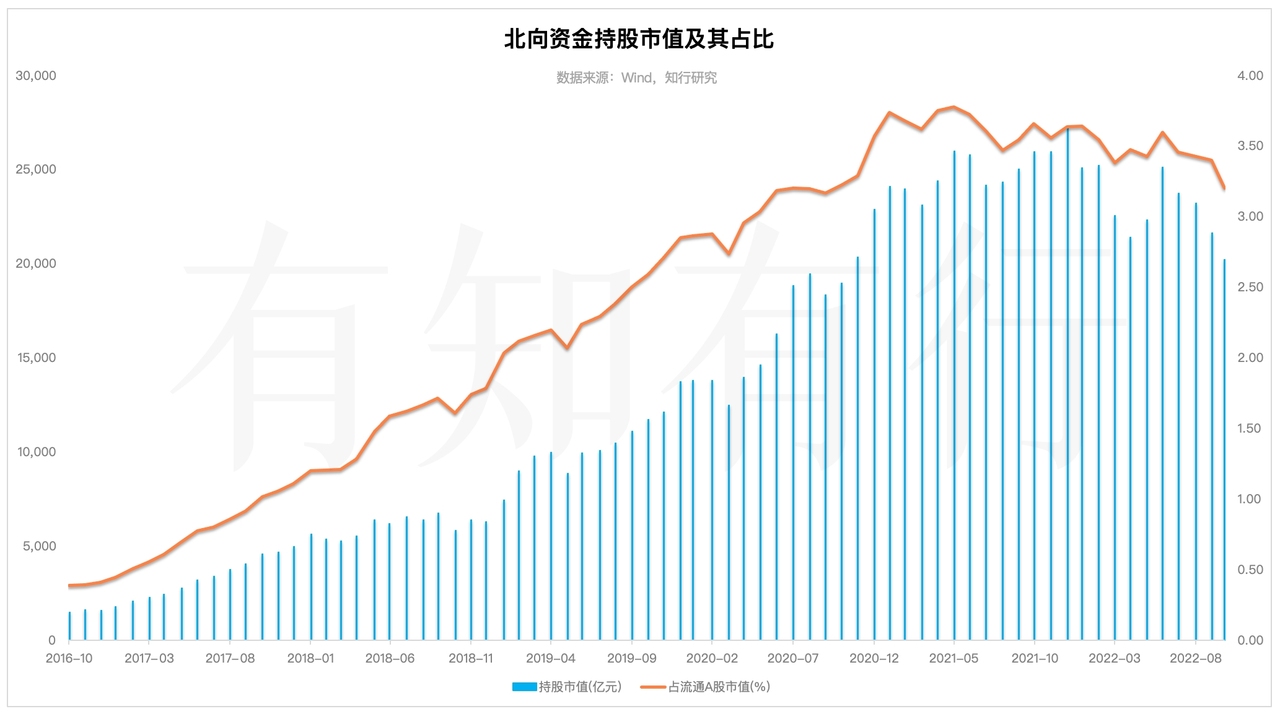 上面这张图,显示了北向资金持有A股的市值变化,以及持股市值在所有A股流通市值的占比变化。能很明显的看出来,从 2016 年到 2020 年底,外资对A股的持仓一直处于增长过程中,外资的影响力也在增长。从 2021 年开始,增速降下来了,今年还有下跌的趋势。