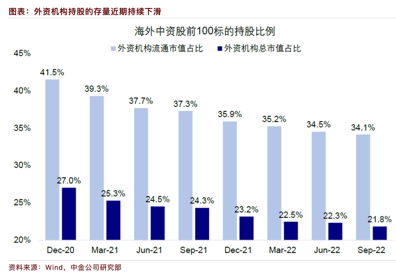 我们拿不到外资在港股和中概股的持仓数据,借用一下中金的研究结果。下面是中金统计的海外中资股(港股和中概股)前 100 名股票里外资机构持股比例的变化情况。从 2020 年 10 月一直到今年 9 月,外资在中资股的持股持续下滑。最新外资持股市值在这些股票流通市值的占比有 34.1%。相比于外资持有A股 3.2% 的比例来说,34.1% 的占比是个很高的水平了。