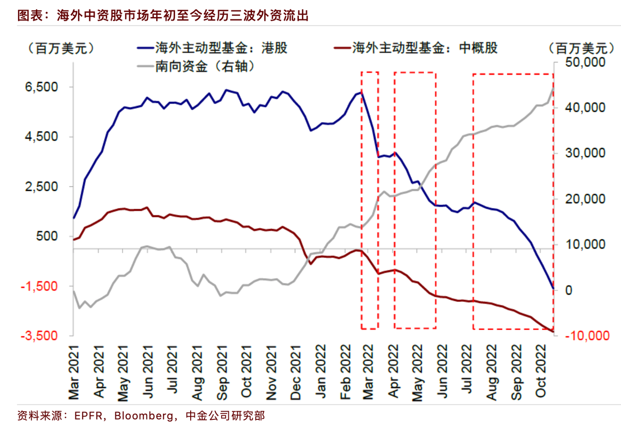 从图里能看出来,今年年初到现在,外资在港股和中概股上持续流出,其中有三波较大幅度的资金流出。从斜率来看,今年 3 月份和这次的流出速度更快一些。这跟港股、中概股今年的表现能很好地对应上。