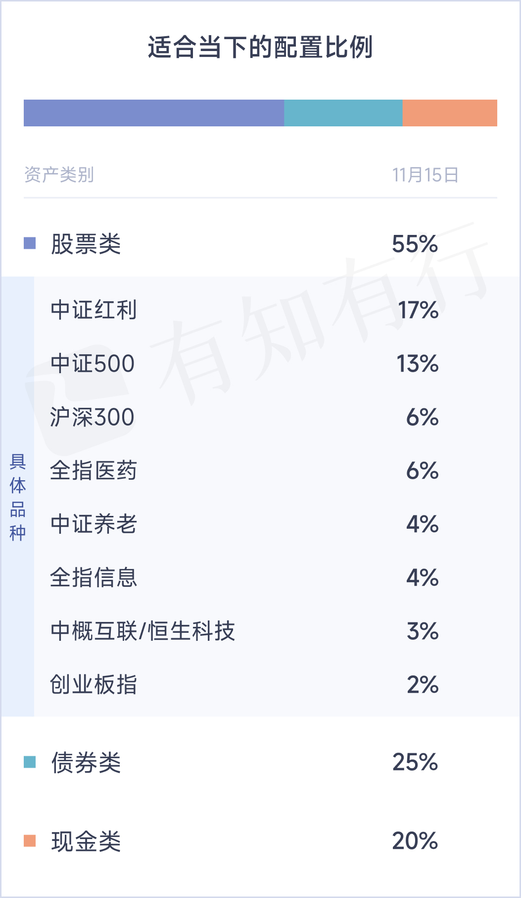 随着市场反弹,长钱账户本周调整了适合当下的配置比例,包括 55% 的股票类资产,25% 的债券类资产,20% 的现金类资产。这个配置比例属于进可攻退可守,未来根据市场情况,长钱账户可以有充足的空间做出调整。