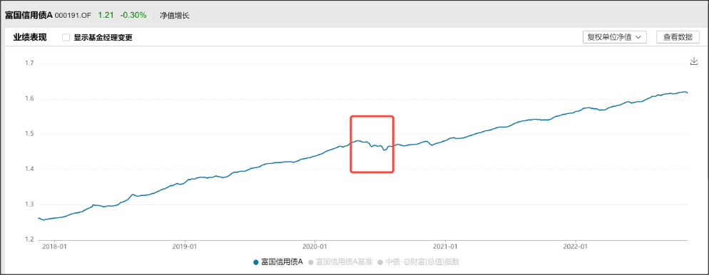 就拿长钱账户的富国信用债A来说,2020 年 4 月份底到 7 月中旬,它赶上了债市的下跌,产品在那次下跌中跌了 1.87%。站在那个时候,跌这么多是有点难受的。但站在 5 年的视角来看,那次下跌只不过是它净值曲线上的一朵小浪花,长期影响很小。