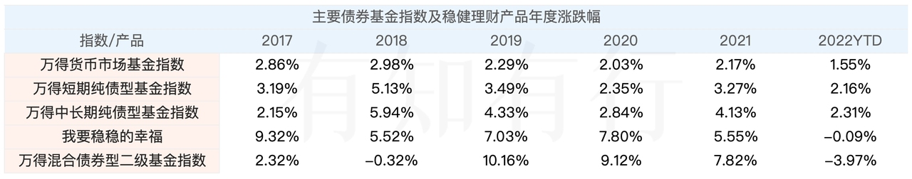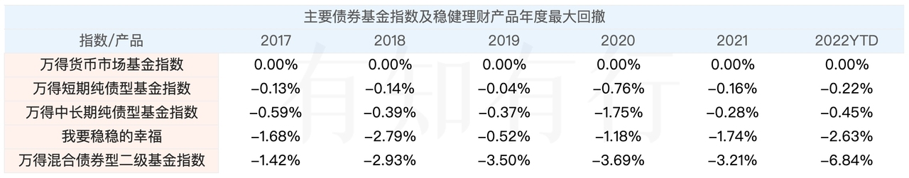 上面列了大家能买到的货币基金、短期纯债基金、中长期纯债基金、我要稳稳的幸福、二级债基金(混合债券型二级基金)指数从 2017 年到现在每年的收益情况以及每年最大回撤情况,大家可以拿来参考。
