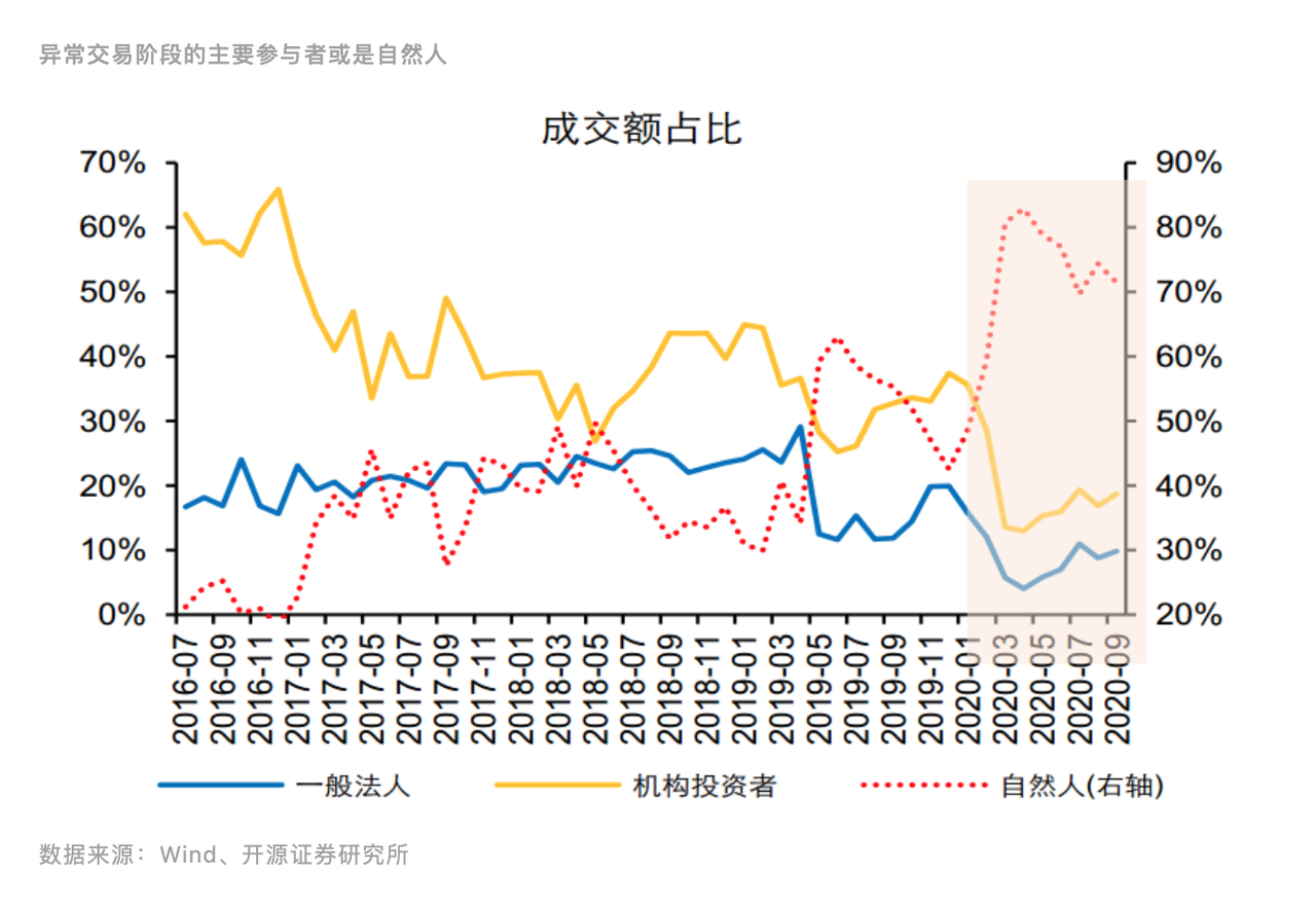 下图展示了可转债主要参与者场内成交额占比情况。我们可以看到,2019 年之前,可转债主要是机构投资者参与较多。今年尤其是 3 月以来,可转债价格波动剧烈,自然人的占比快速提升,而游资在自然人中起到了很大作用。