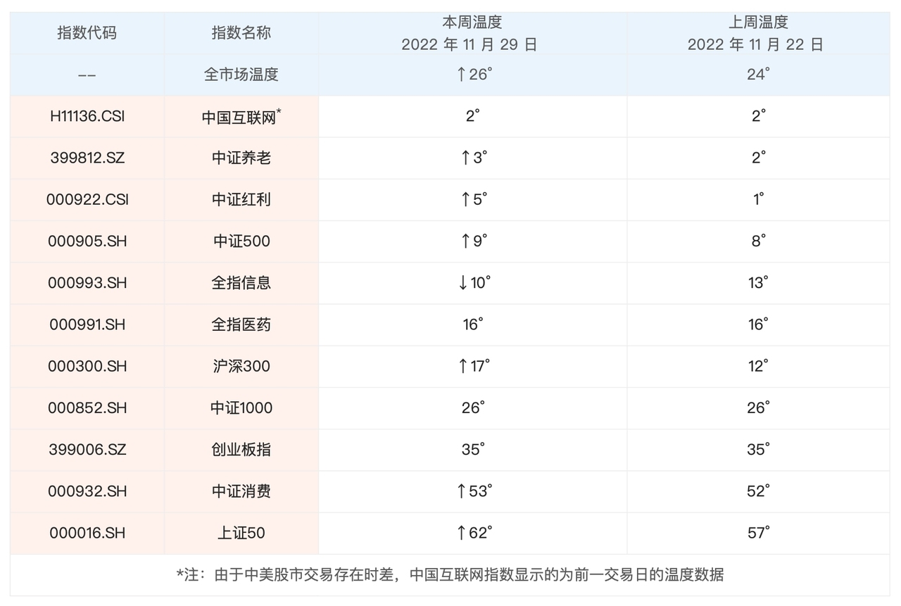 经历了一周的变化,全市场温度小幅上涨,最新的全市场温度是 26°。具体指数方面,分化还是很明显的,作为价值股的代表指数,中证红利表现最好,最近一周涨了 4.7%,相对而言,成长股的代表指数创业板指则出现了小幅下跌。