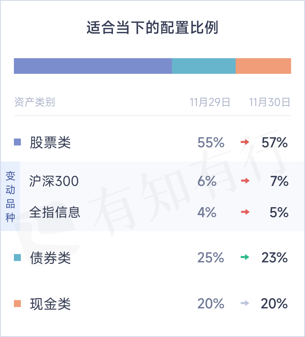 经过11.29日的上涨📈,沪深300和全指信息的温度🌡️都有所上升~ 股票仓位反而有所上升,从55%提升到了57%。 能讲讲这个变化的逻辑吗?