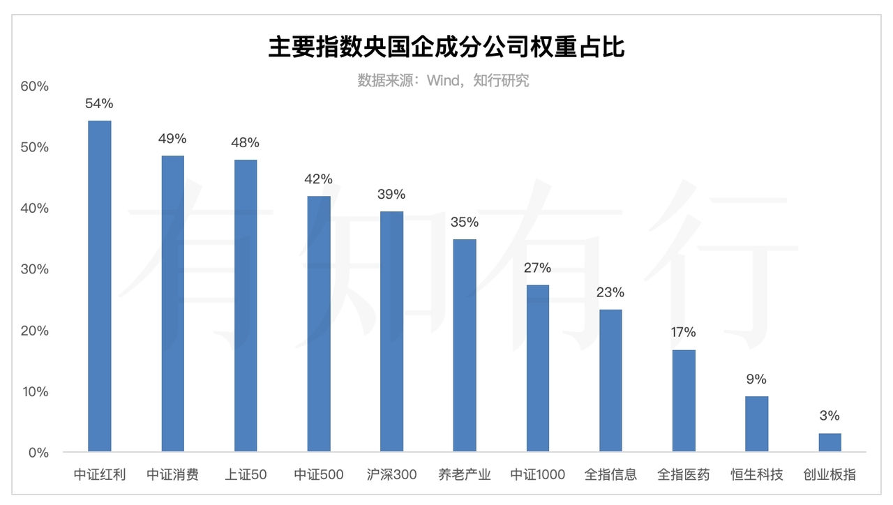 这些指数中,创业板指里央国企的权重最低,只有 3%。恒生科技也很低,只有 9%。这种注重成长性、注重新兴产业发展的指数里,央国企的覆盖度较低。