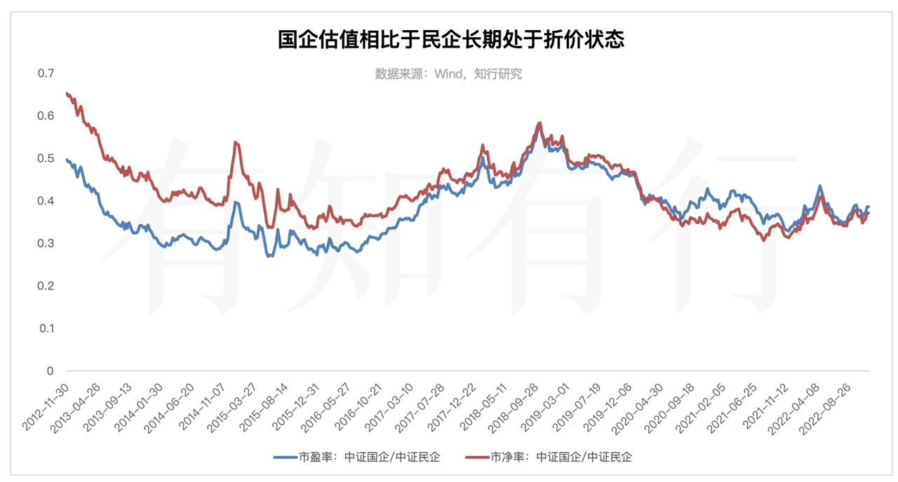 无论是市盈率还是市净率,中证国企/中证民企的相对比例长期都是低于 1 的,这意味着,国企估值相对于民企来说,长期处于折价状态。这跟两个群体背后代表的行业阶段、商业模式有很大的关系。