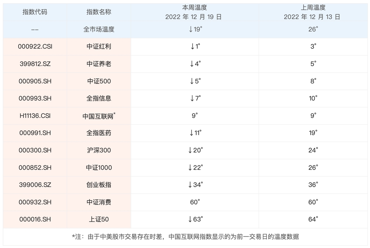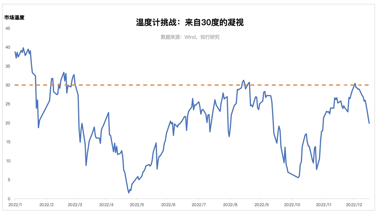 最近股市的回调从上面的图里能明显看出来。之前股市从 11 月初开始一路反弹,全市场温度也快速提升,一度涨到了 30° 附近。然而最近随着市场全面下跌,全市场温度再次回落。最新的全市场温度跌到了 19°。