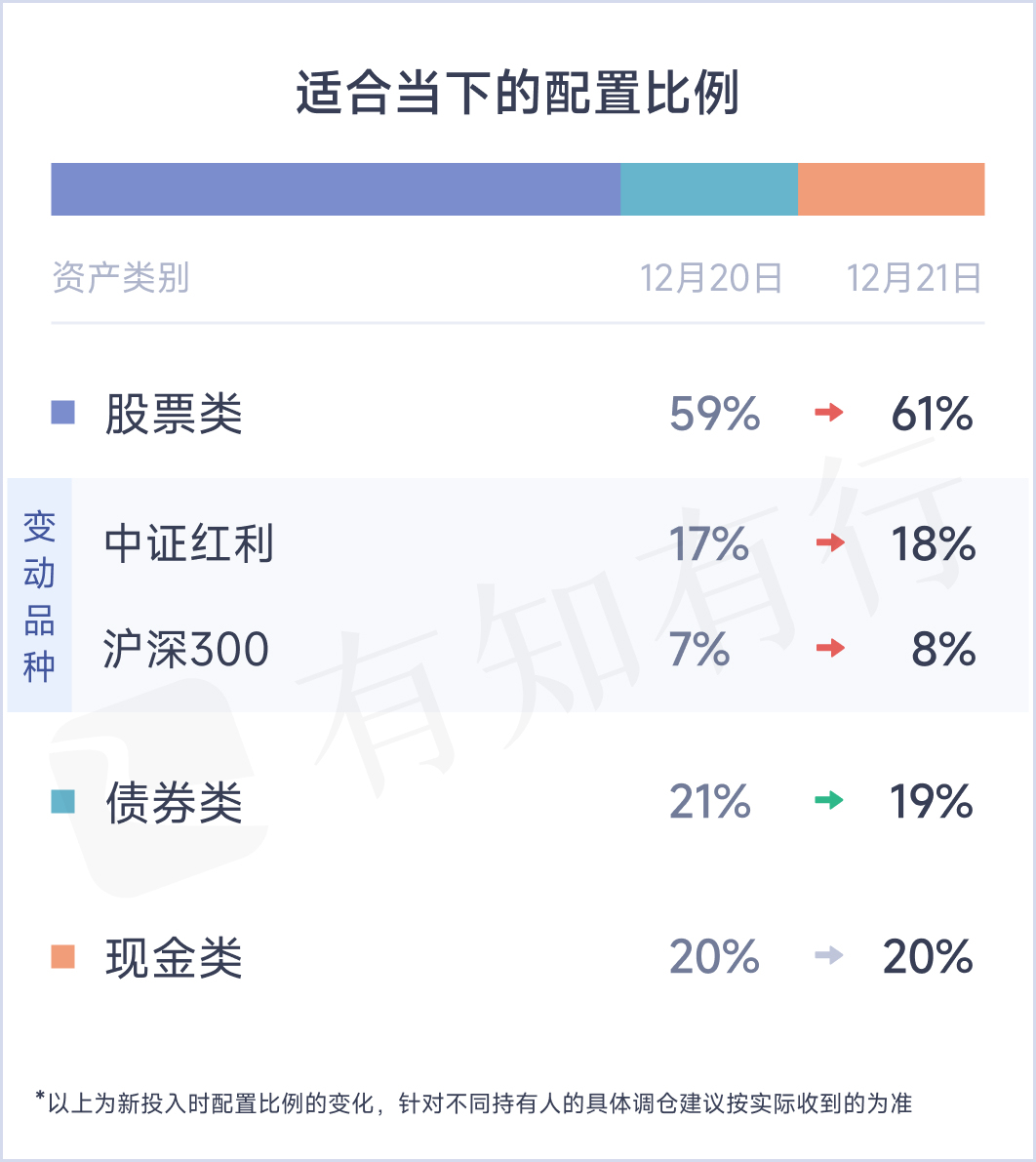 为了应对市场的快速调整,长钱账户触发了临时加仓信号,调整了「适合当下的配置比例」,将股票类资产的比例从 59% 提高到了 61%,增加的仓位分别给了中证红利和沪深300。