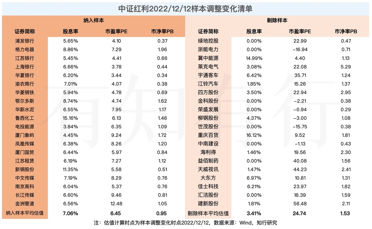下图是中证红利今年年末样本调整情况,大家可以整体感受一下。此次中证红利调整后,指数的股息率提高了,估值降低了。由于有知有行的数据源原因,指数调整成分股的行为会在月末体现出来,我们下月初还可以详细说一下。但基金已经调整得差不多了,不影响长钱账户的买入。