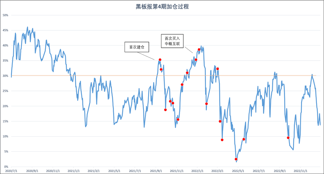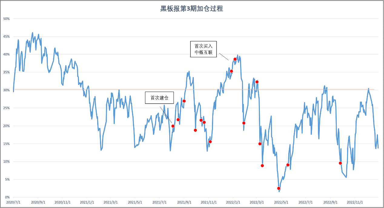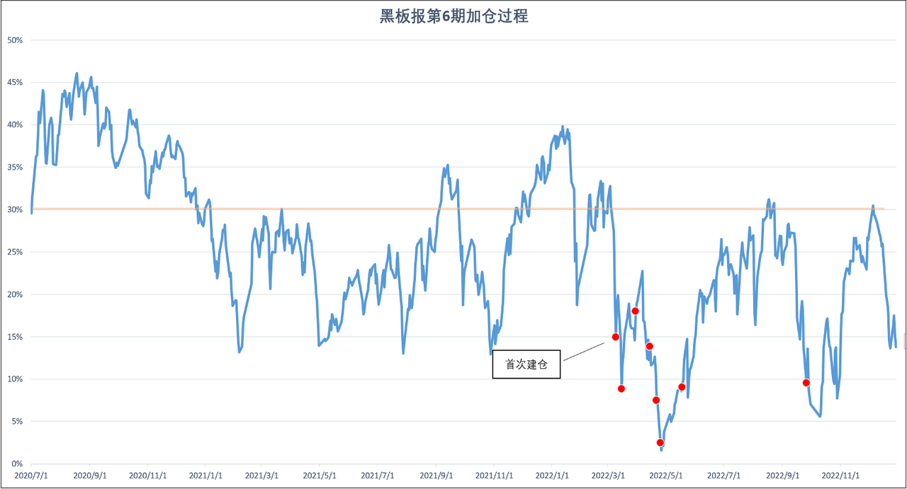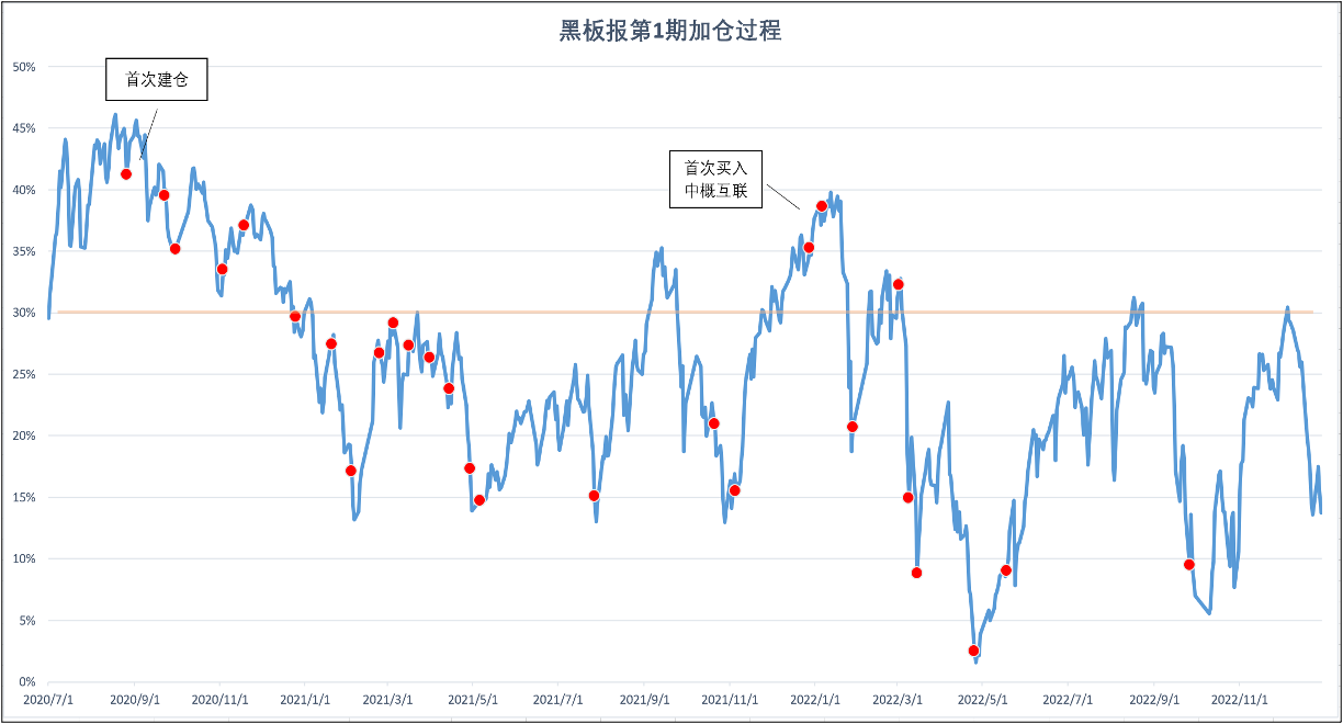 我们拿黑板报第 1 期的历史加仓情况来看一下,今年黑板报策略是如何贯彻越跌越买、逆向投资的。下面这张图是黑板报第 1 期从 2020 年 8 月份首次建仓后,是如何一步步加仓的。