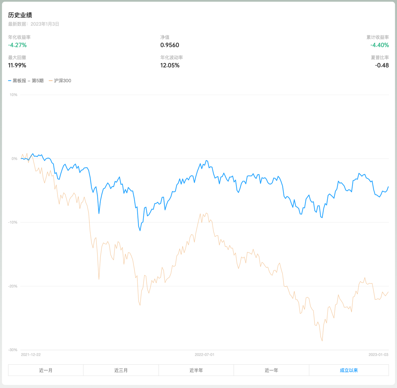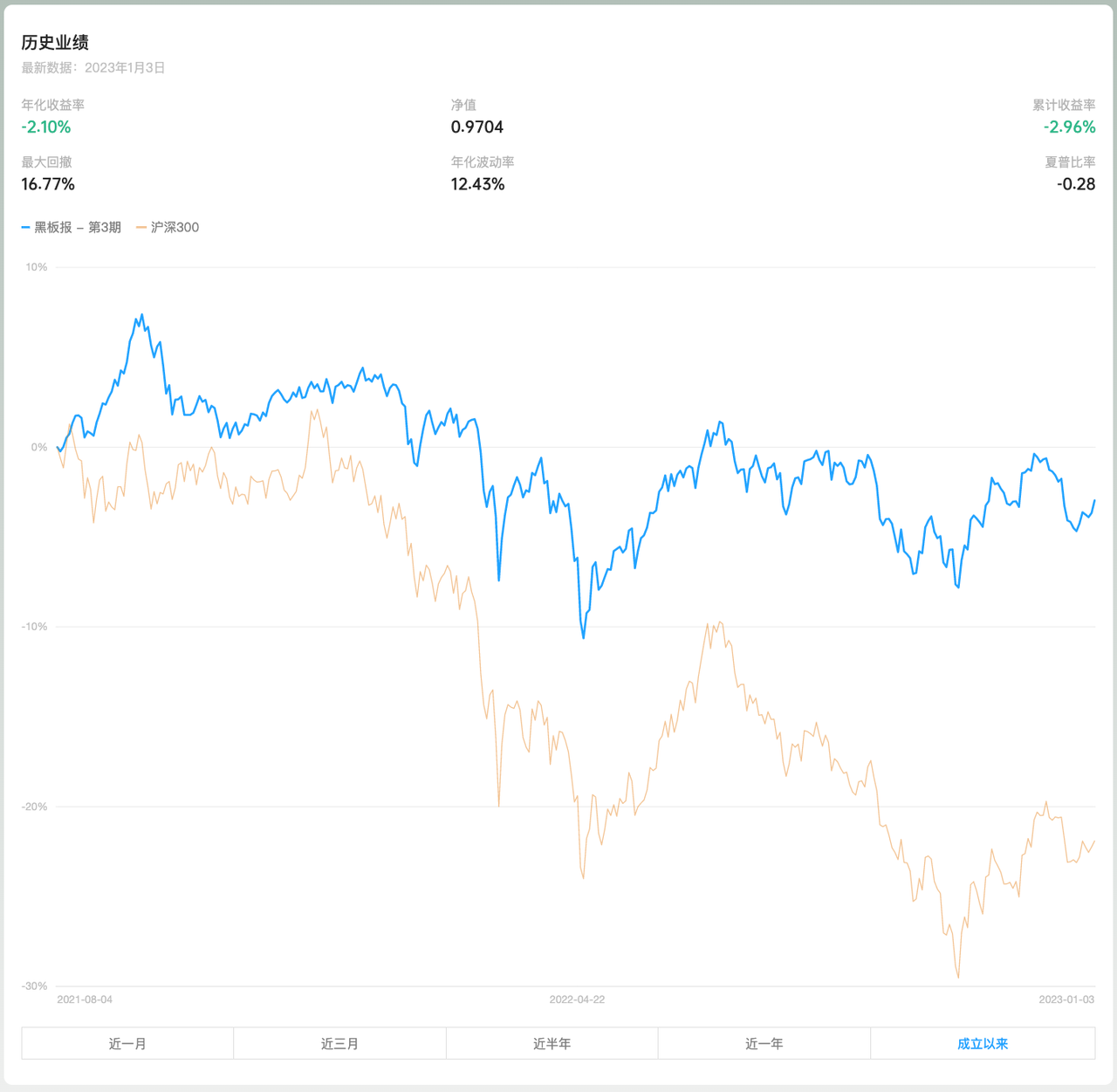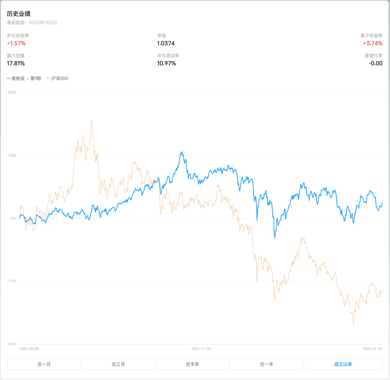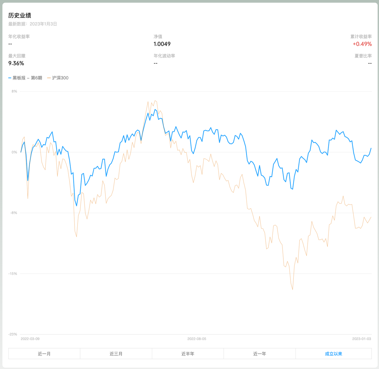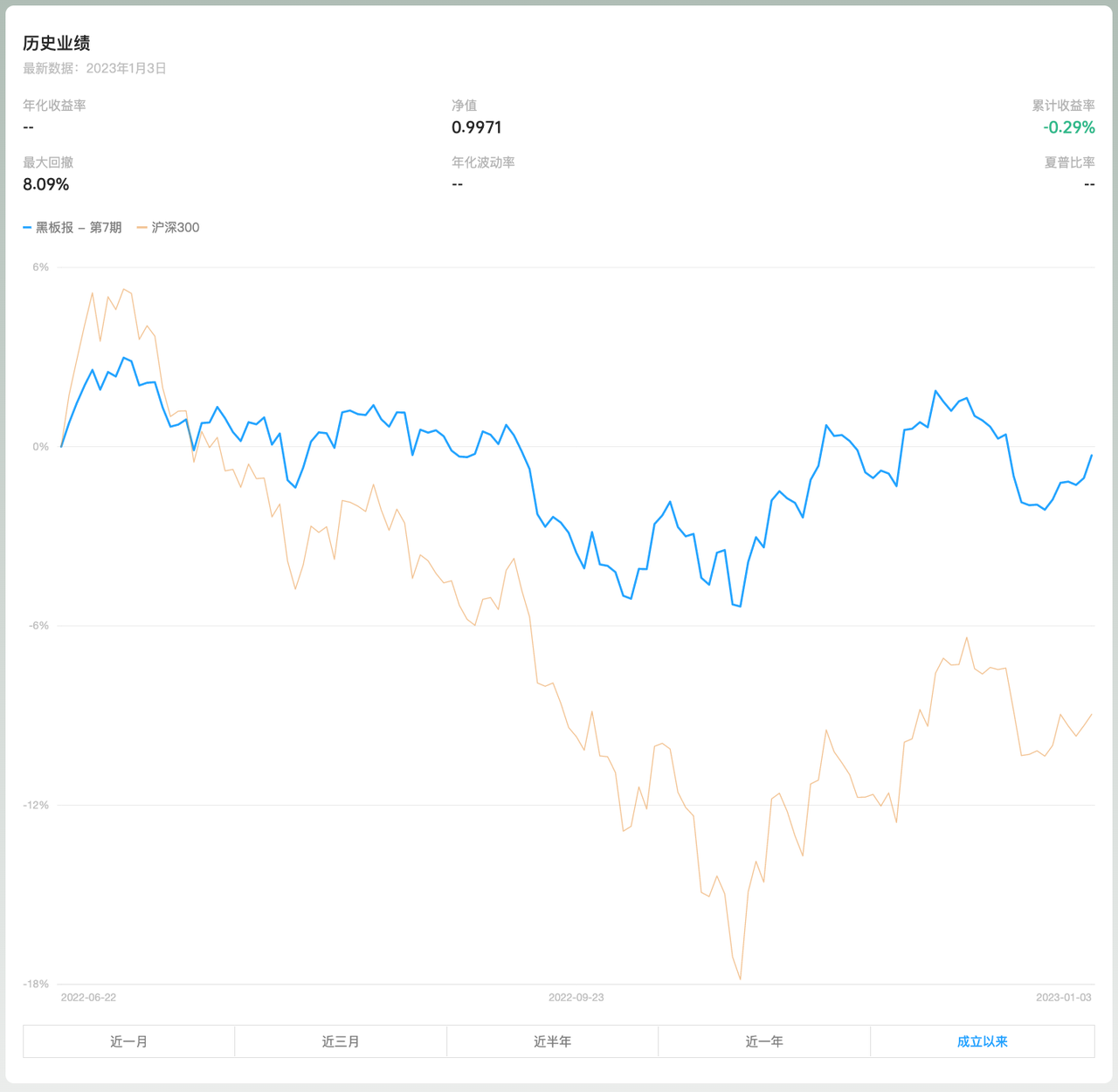 经过市场两年多的大涨大跌,黑板报第 1 期相比市场整体表现来说,波动会小很多,这两年的市场太差了,导致也没赚到什么钱。目前对于该产品来说,仅仅是播种的季节,我们期待未来收获季节的早日到来。