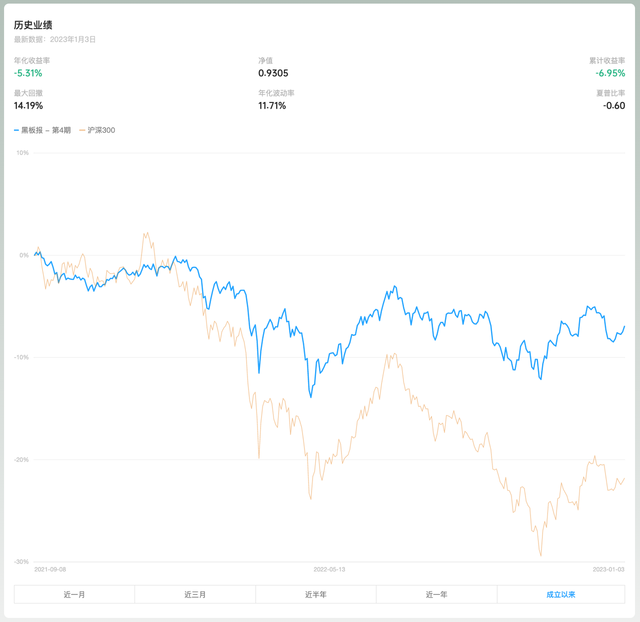 黑板报第 4 期开始于 2021 年 9 月 7 日,自打成立后,一直到现在,第 4 期都是这几期黑板报里,经常挨骂也是唯一挨骂的一期。为什么挨骂?是因为多期产品放在一起,它的业绩最差。很多时候,大家还是想要绝对收益,并不在意是不是亏得比市场少。