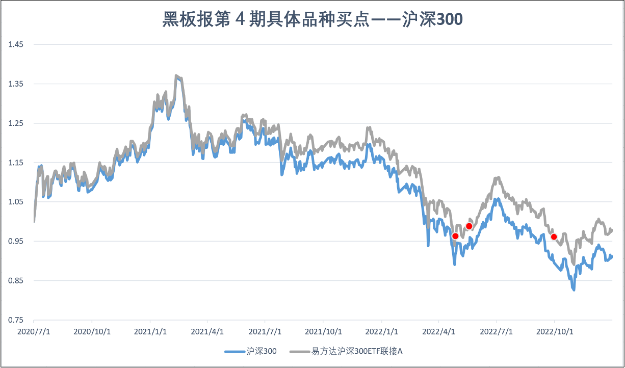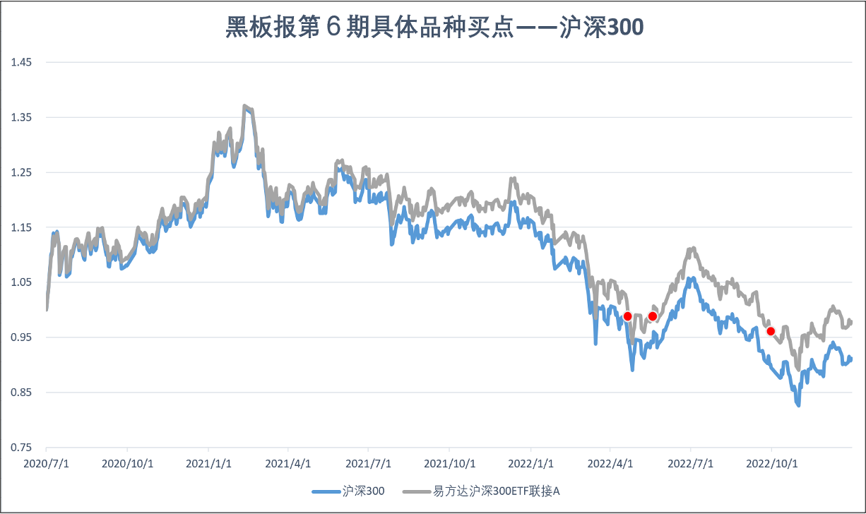 当买入时的股票、现金的比例没发生变化,买入的基金发生改变时,也就意味着当时黑板报第 5 期不支持买入了,因此开启了第 6 期。黑板报第 6 期开始于 2022 年的市场底部,从下面每个品种的买点来看,买的位置都很低,看上去就有种开心和幸福的感觉。如果那个时候肯加仓,多多买入的话,从资金加权收益的角度来说,你今年的收益会不错。从这一点能看出来,市场真的给机会时,要勇敢地抓住。