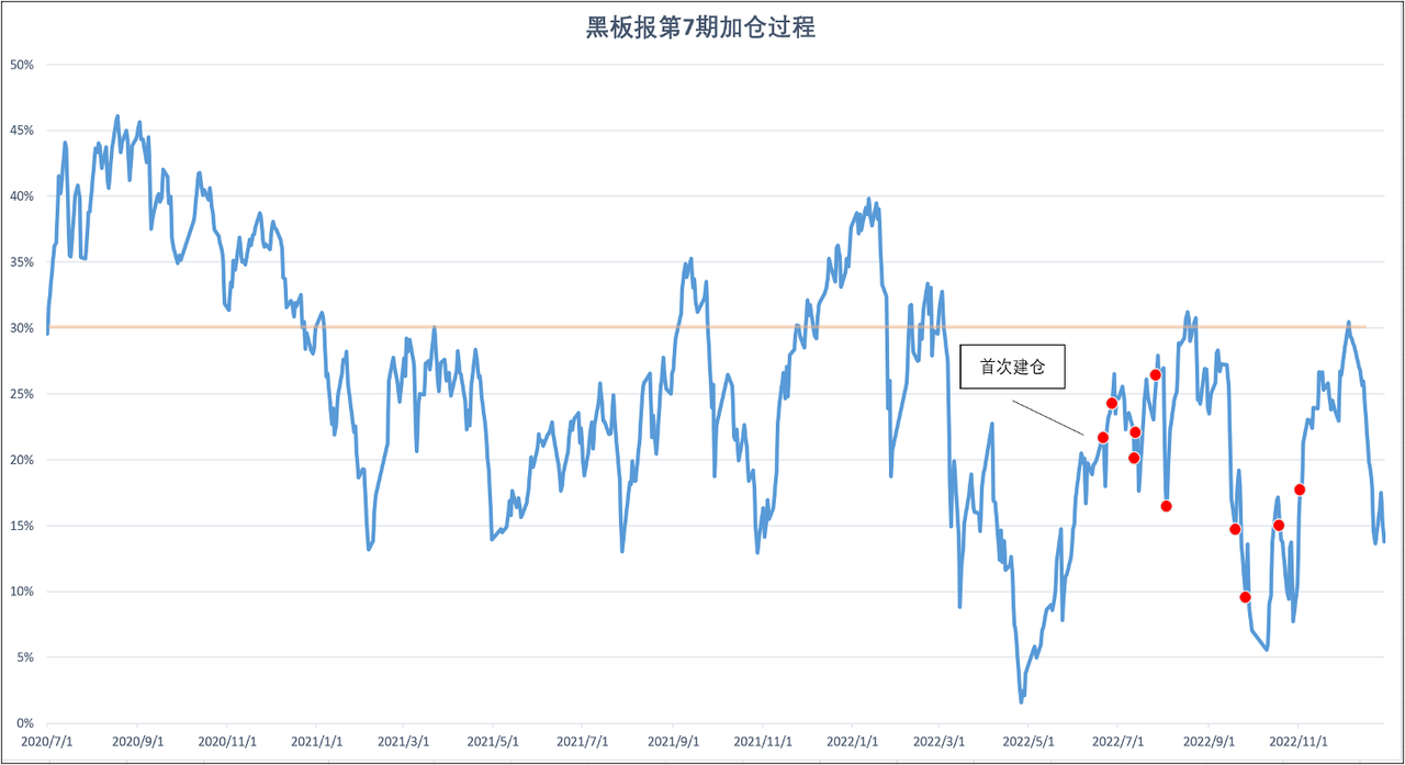 黑板报第 7 期是黑板报策略的最后一期产品,之后长钱账户就推出了。黑板报第 7 期开始于 2022 年 6 月 21 日,从上面加仓过程图里能看出来,当时全市场温度经历了 4 月底的低点之后,出现了一波反弹。当时的黑板报第 6 期趁着 3、4 月份的大跌,快速提高了股票仓位,随着全市场温度的快速反弹,黑板报第 7 期来了,它降低了当时买入时的股票仓位。