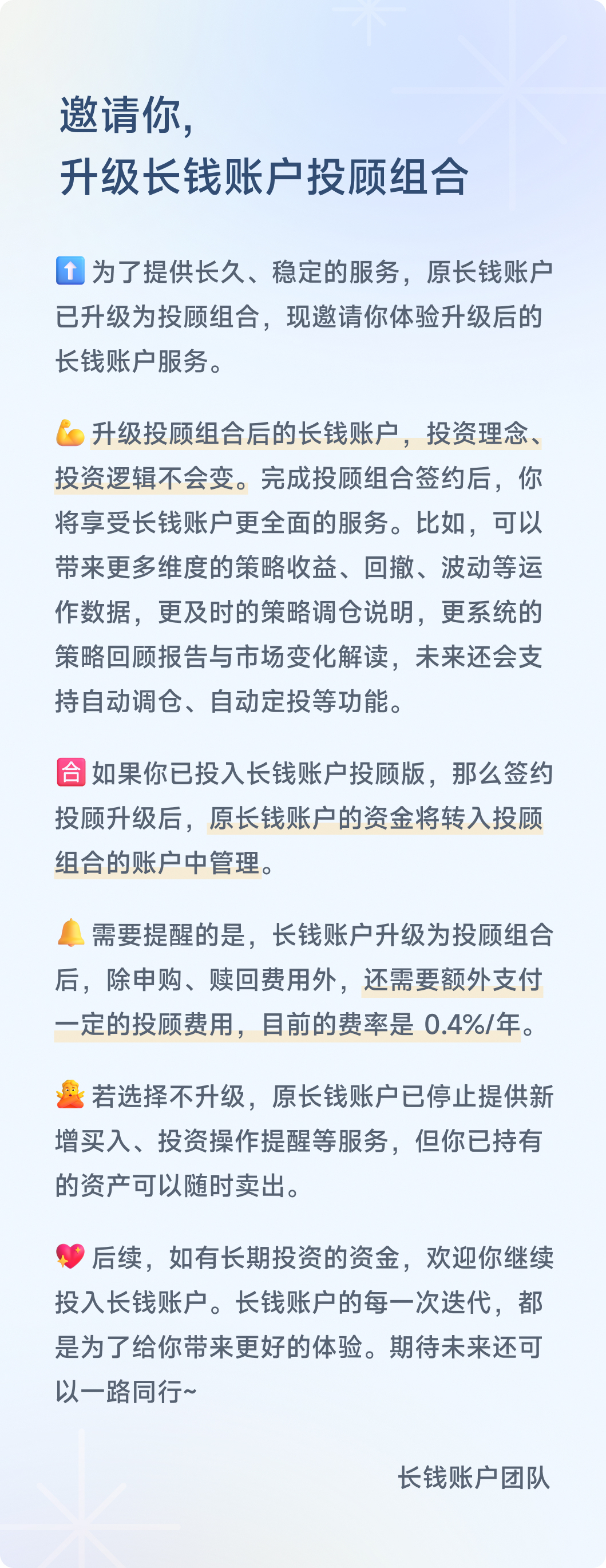 感谢你的耐心等待,原长钱账户升级投顾的功能在今天上线啦🎉