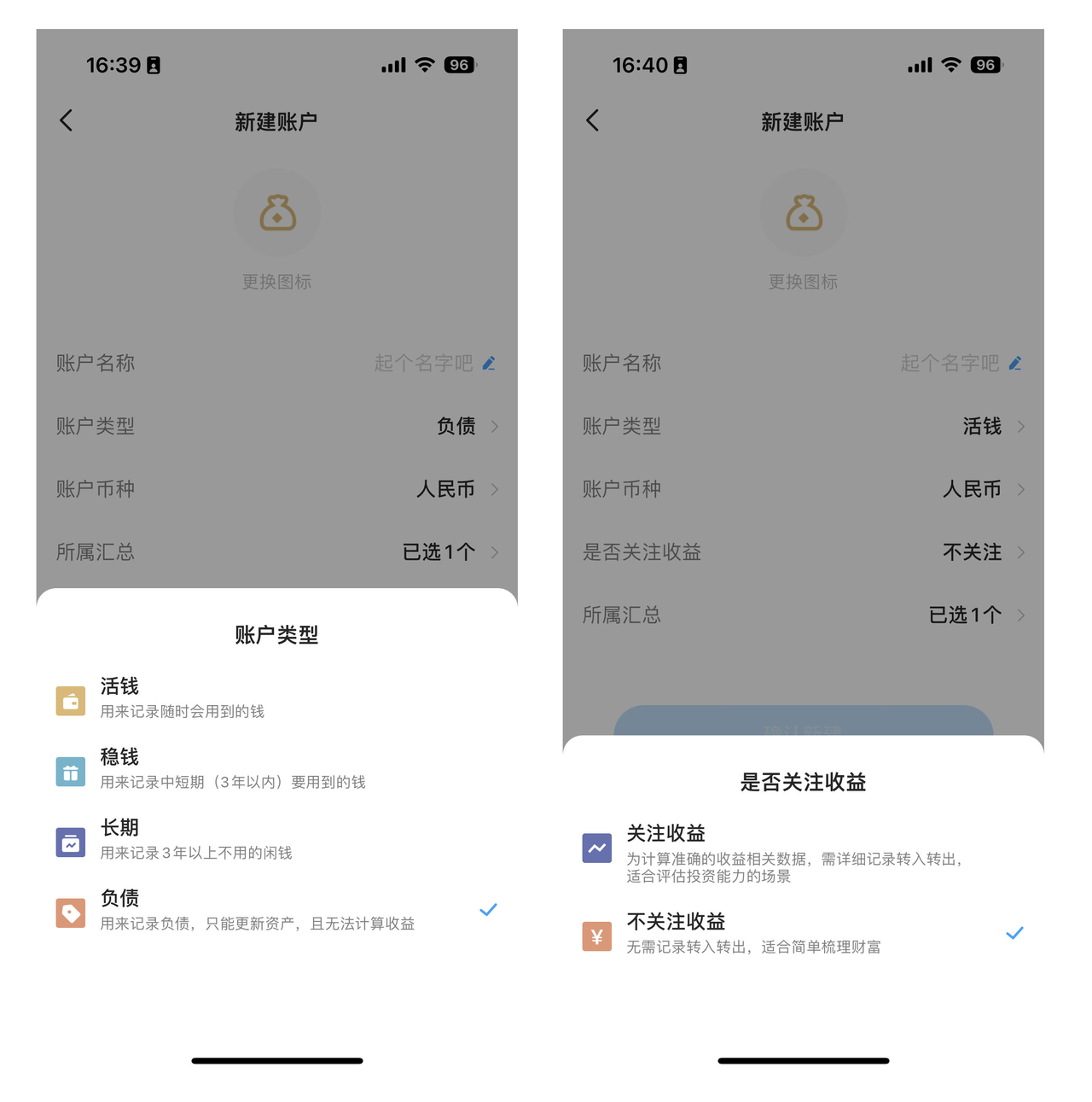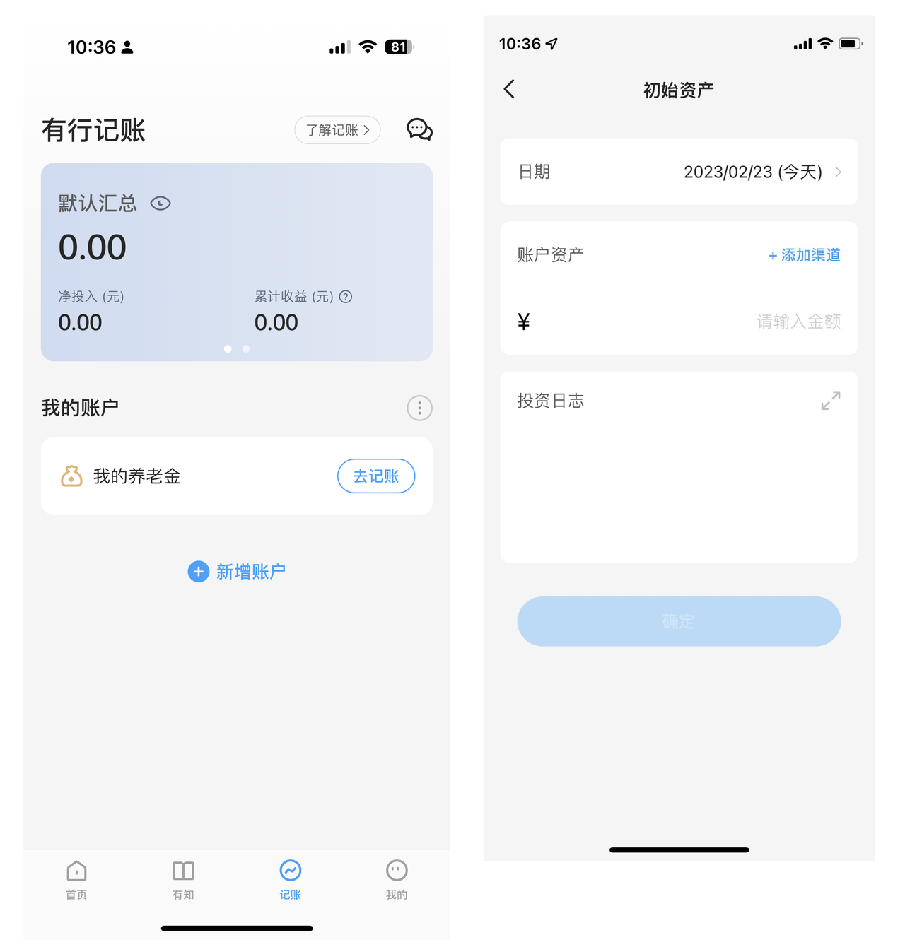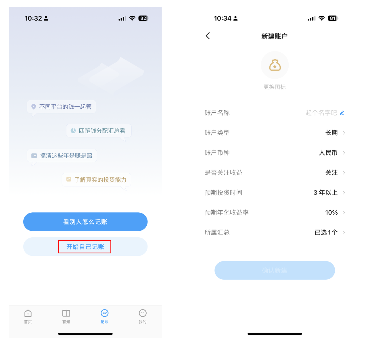 这两者都是为了梳理资产而存在的,在有行记账中也可以记录。在「新建账户」页面选择对应的账户类型,选择「不关注收益」即可。
