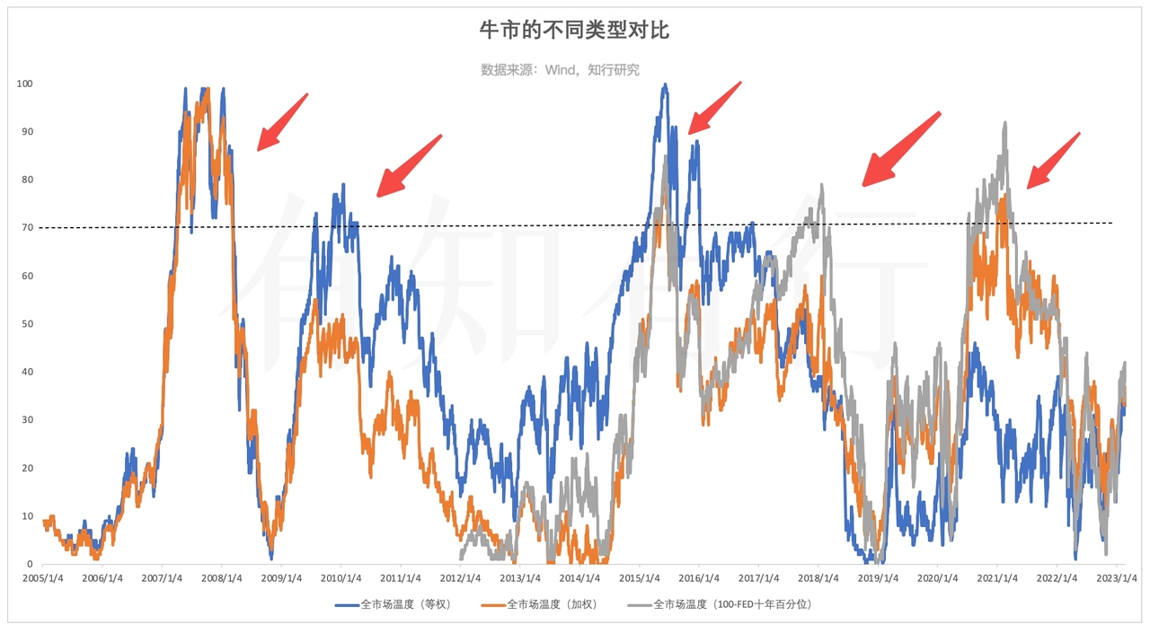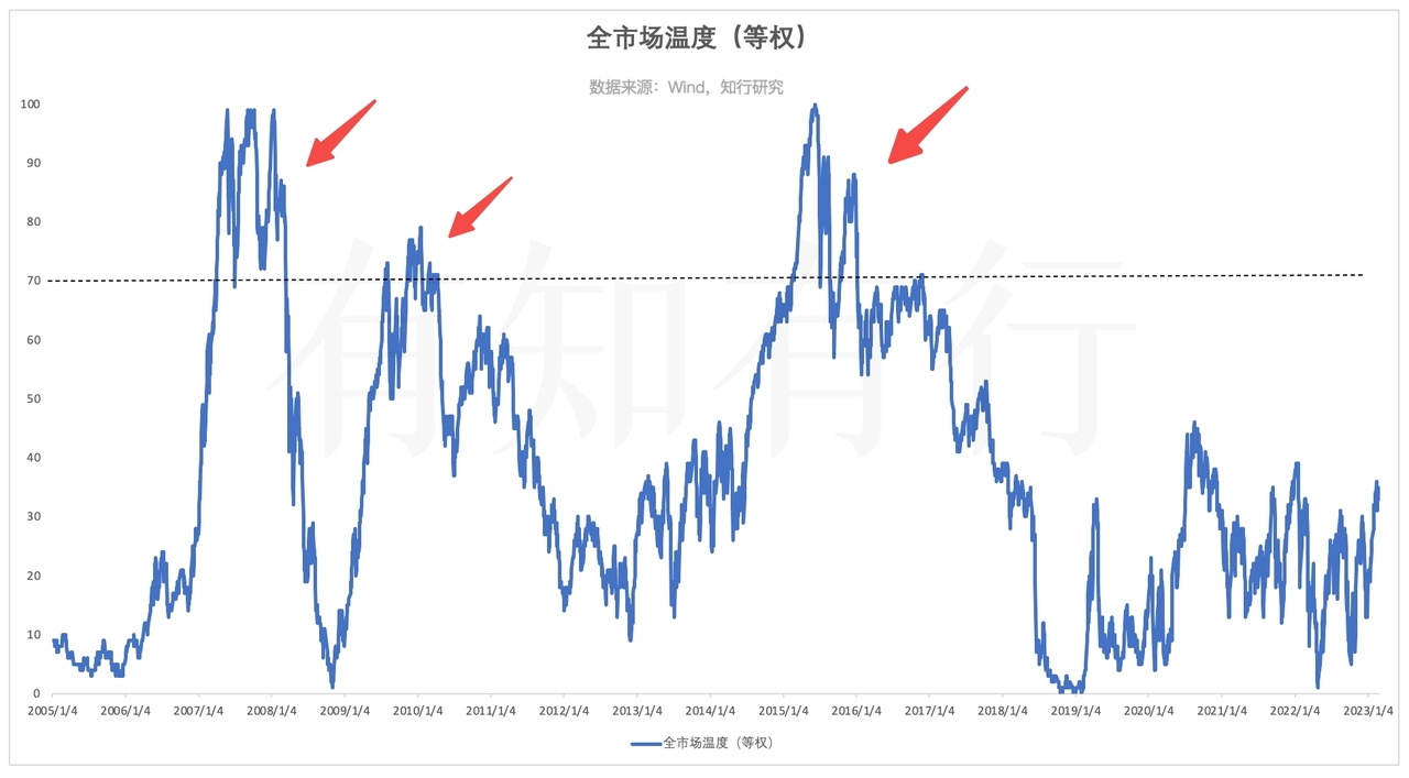 一句话来说,全市场温度(等权)衡量的是全面熊市和全面牛市的周期。我们只看牛市的情况,下面这张图里,我们将全市场温度(等权)在 70° 以上定义为高估区域,红色箭头对应的就是牛市高估阶段,分别是 2007 年、2009 年、2015 年那三轮牛市的高峰。如果对过往A股历史很熟悉的话,就会知道那三轮牛市都是全面牛市,市场上大部分个股和指数都出现了上涨,到现在还能想起当时市场的疯狂情绪。