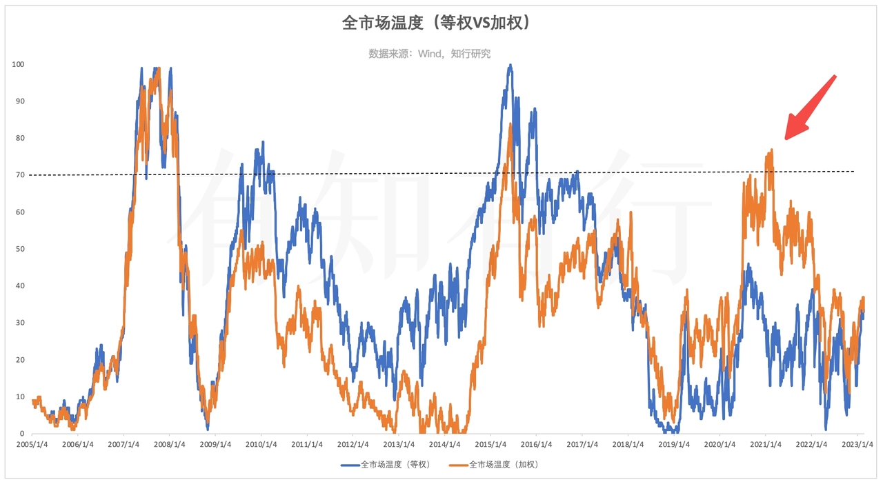 第二个时间段是 2020 年底,全市场温度(加权)和全市场温度(等权)出现了明显的分化,而且是首次出现加权温度遥遥领先等权温度的情况。那是因为,2020 年那一轮牛市属于结构性牛市,大盘股的表现远远好于中小盘股,拥抱核心资产成为了潮流。