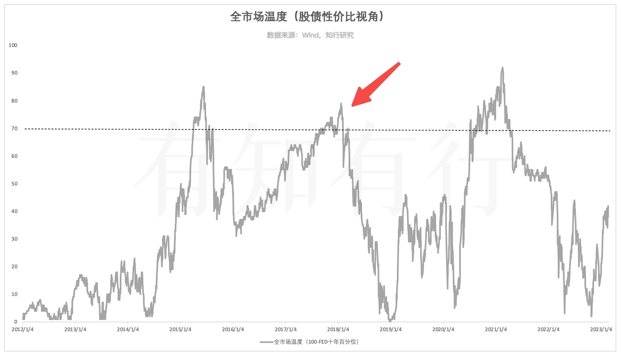 从上面的例子能看出来,考虑股债性价比的全市场温度提供了另一个视角,也就是从股债大类资产配置的视角来看,股市是不是处于高估区域。