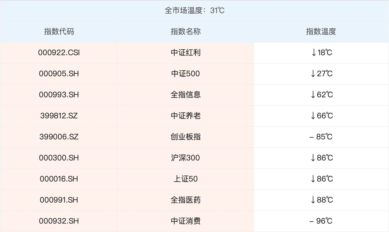 股市温度为 31℃,跟上期相比,继续降低。具体指数温度也都继续回落,中证红利、中证 500 还处于低估区间,温度分别是 18℃ 和 27℃。其他指数整体温度很高,我们还需要慢慢等待。