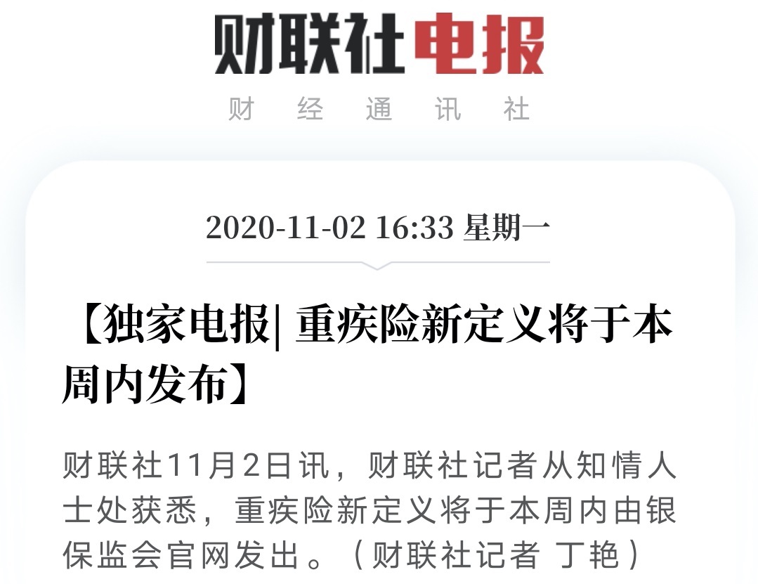 根据财联社新闻,重疾险新定义将于本周内发布。