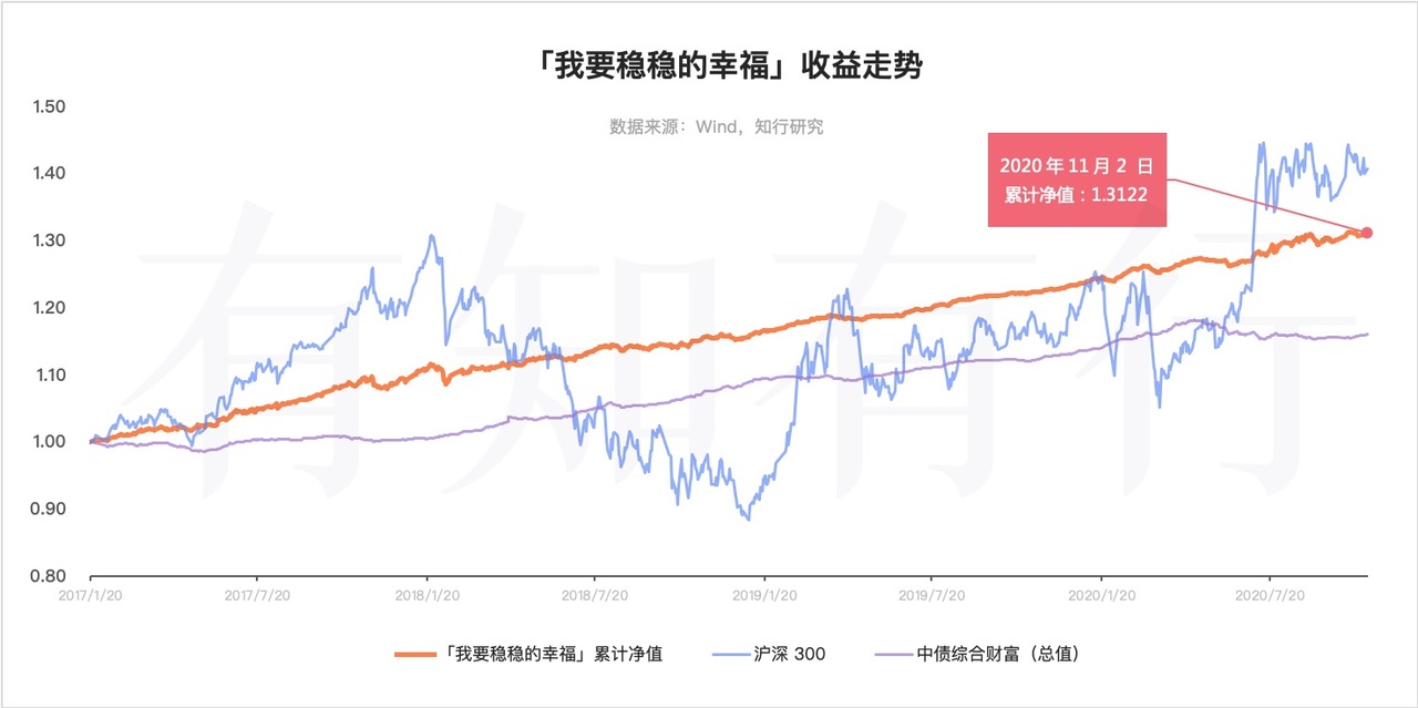 另外,「我要稳稳的幸福」是个绝对收益类的产品,期望每年能获得 6%~8% 的目标收益率。持有 1 年以上,获得目标收益率的可能性会很大。回看了一下「我要稳稳的幸福」每年的表现:2017 年上涨9.32%、2018 年上涨 5.52%、2019 年上涨 6.77%、2020 年至今上涨 6.08%,基本上达到了它的目标,大家需要做的是耐心持有。
