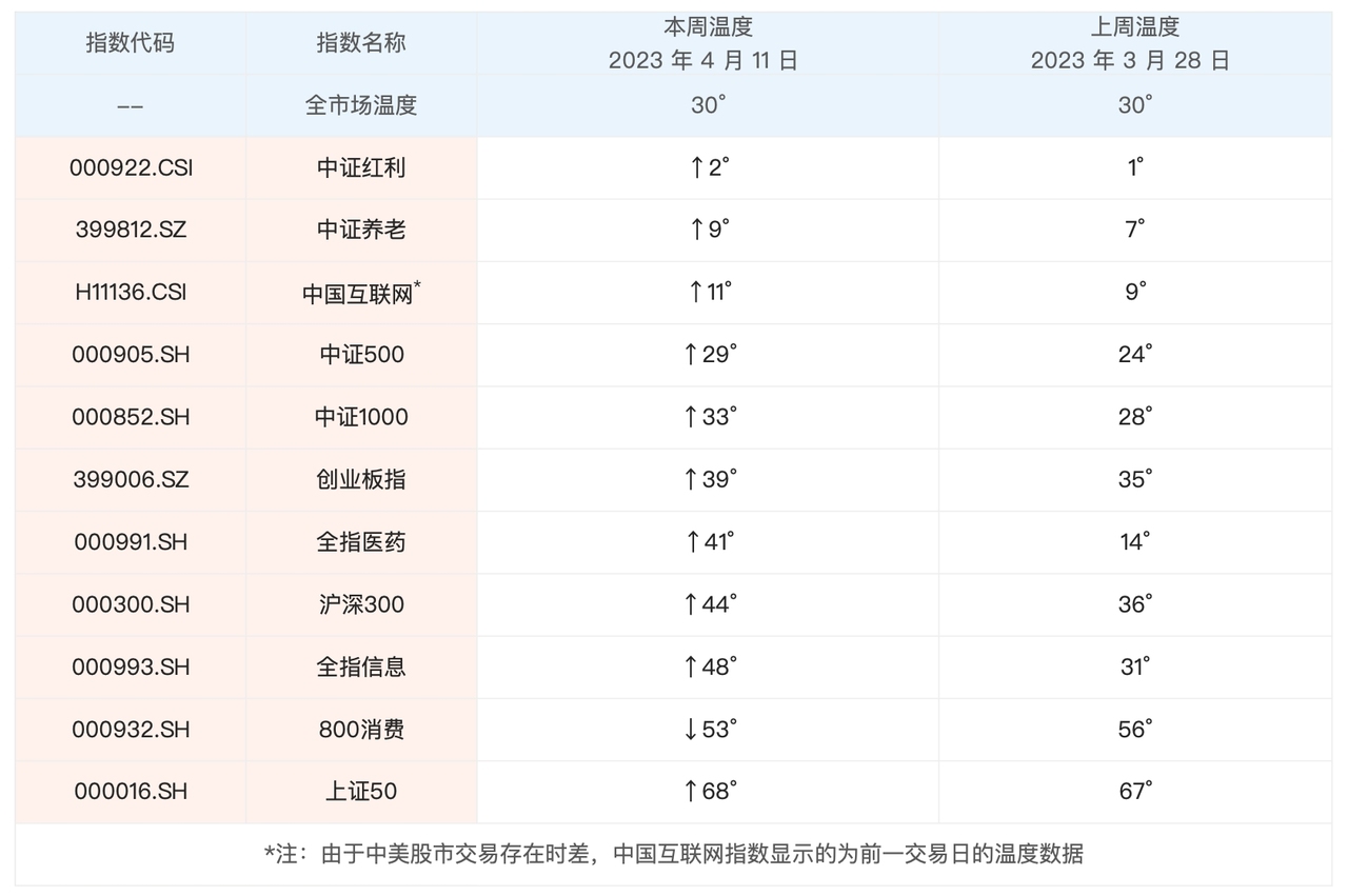 4 月以来A股整体出现了小幅度的上涨,涨幅主要是上周贡献的,这周前两天整体出现了回调。最新的全市场温度是 30°。具体指数方面,宽基指数例如沪深300、中证500从 4 月 1 日到 4 月 11 日分别上涨了 1.22%、1.28%。行业主题指数里面,4 月以来涨幅居前的有全指信息、全指医药,分别上涨 3.27%、3.15%,其余指数多数出现上涨,但幅度不大。表现最差的是以食品饮料为代表的800消费,4 月以来下跌了 3.54%。