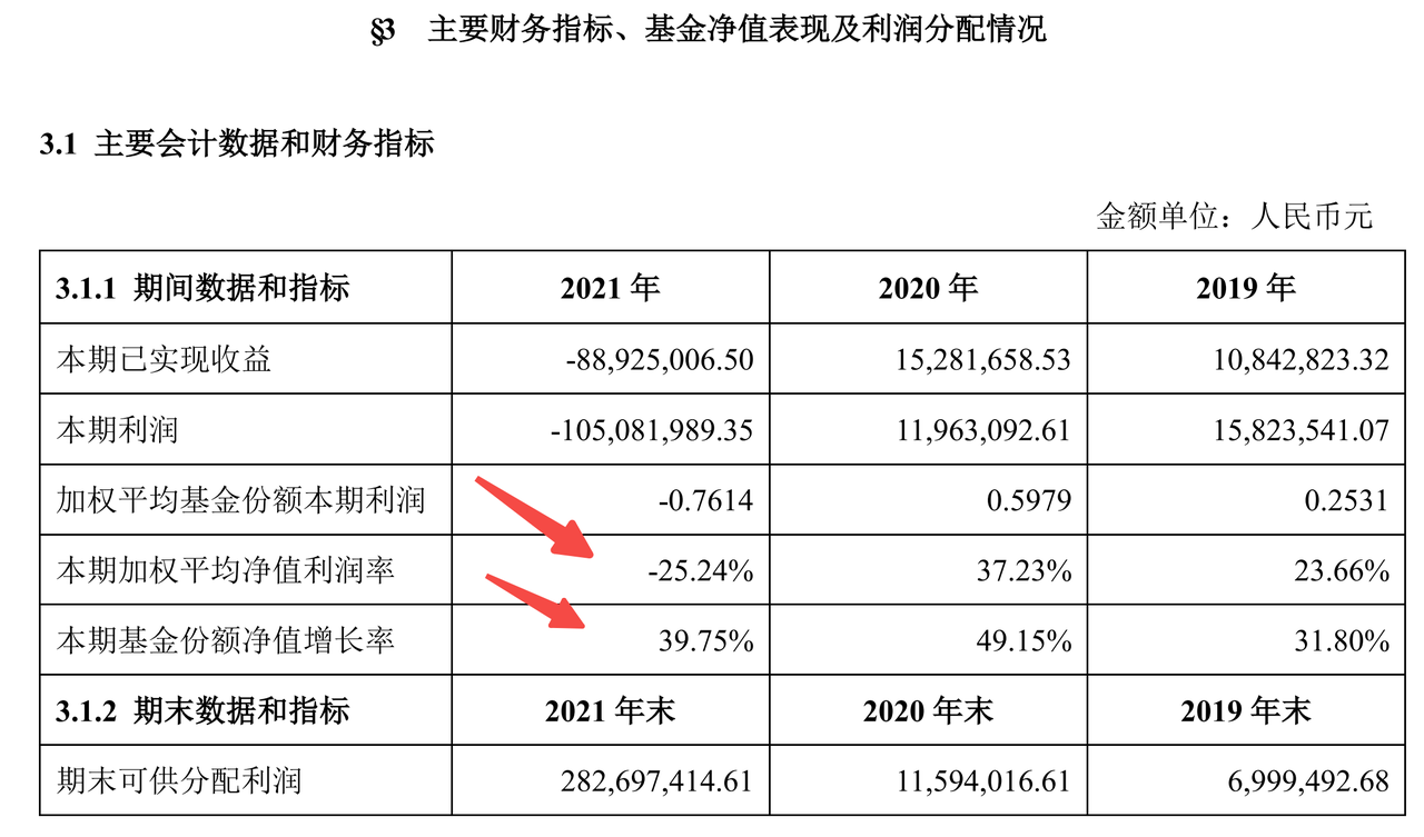 大家在统计基民回报时,用到了「加权平均净值利润率」这个指标。这个指标主要通过基金的半年报、年报进行披露。下面这张图我们选了某只基金 2021 年的年报进行展示。红色箭头标注的有两个指标,其中「基金份额净值增长率」就是大家在各个平台看到的基金收益率。拿这只基金来说,2021 年基金上涨了 39.75%。这意味着,如果你从 2021 年年初开始一直持有这只基金到年末,期间没有追加没有赎回的话,就会获得这个回报水平。