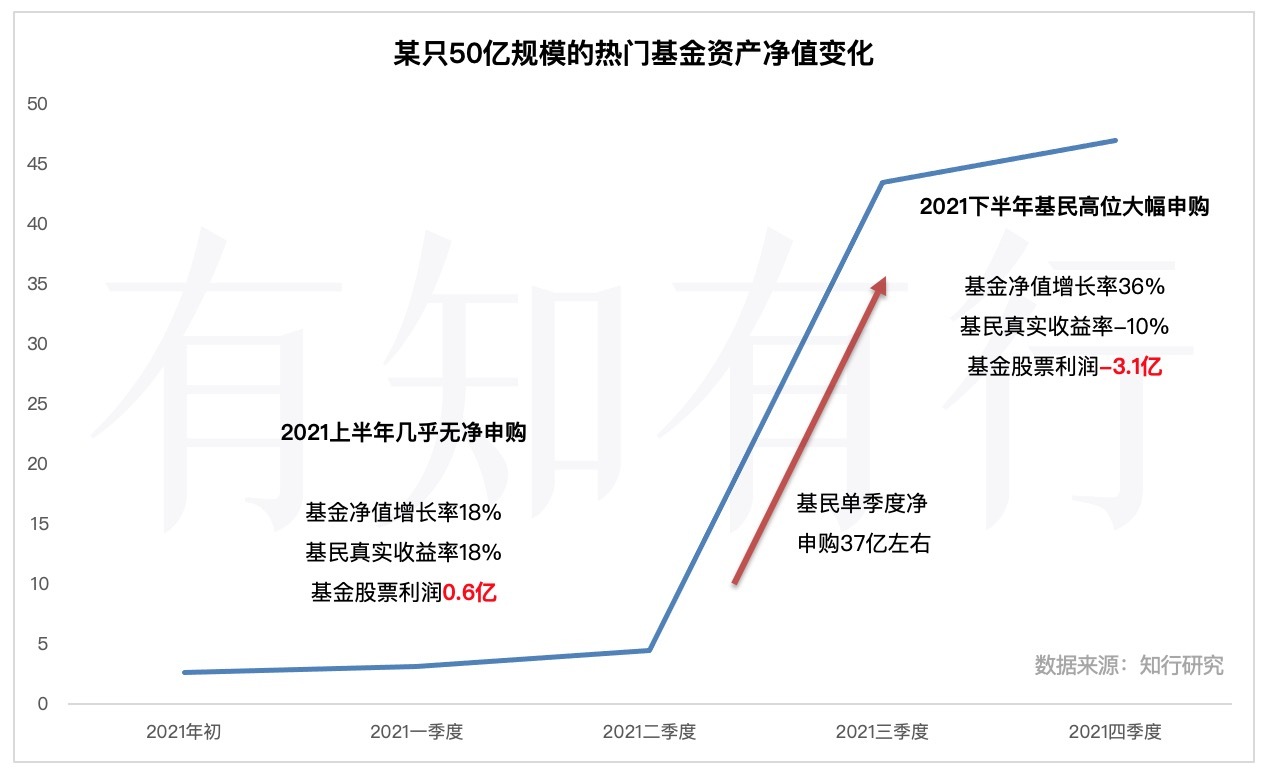 对于后进入的大量投资者,他们实际投资体验并不会太好,除了心理落差比较大以外,甚至出现了真实的亏损。这是追涨带来的代价。下面这张图是另一只热门基金在 2021 年的基金规模变化情况,大家可以仔细体会一下。