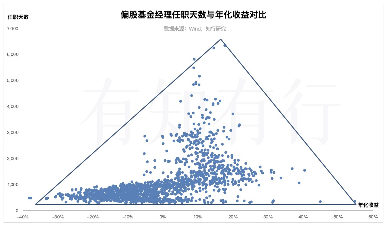 我们把偏股混合基金的基金经理的任职天数和任职以来的年化收益作为对比,可以发现其呈现一个明显的三角形状。随着任职日期的增加,其年化收益也逐渐往中间收敛。而任职日期在 1000 天(3 年)以下的基金经理的业绩分布呈现极度发散的状态。