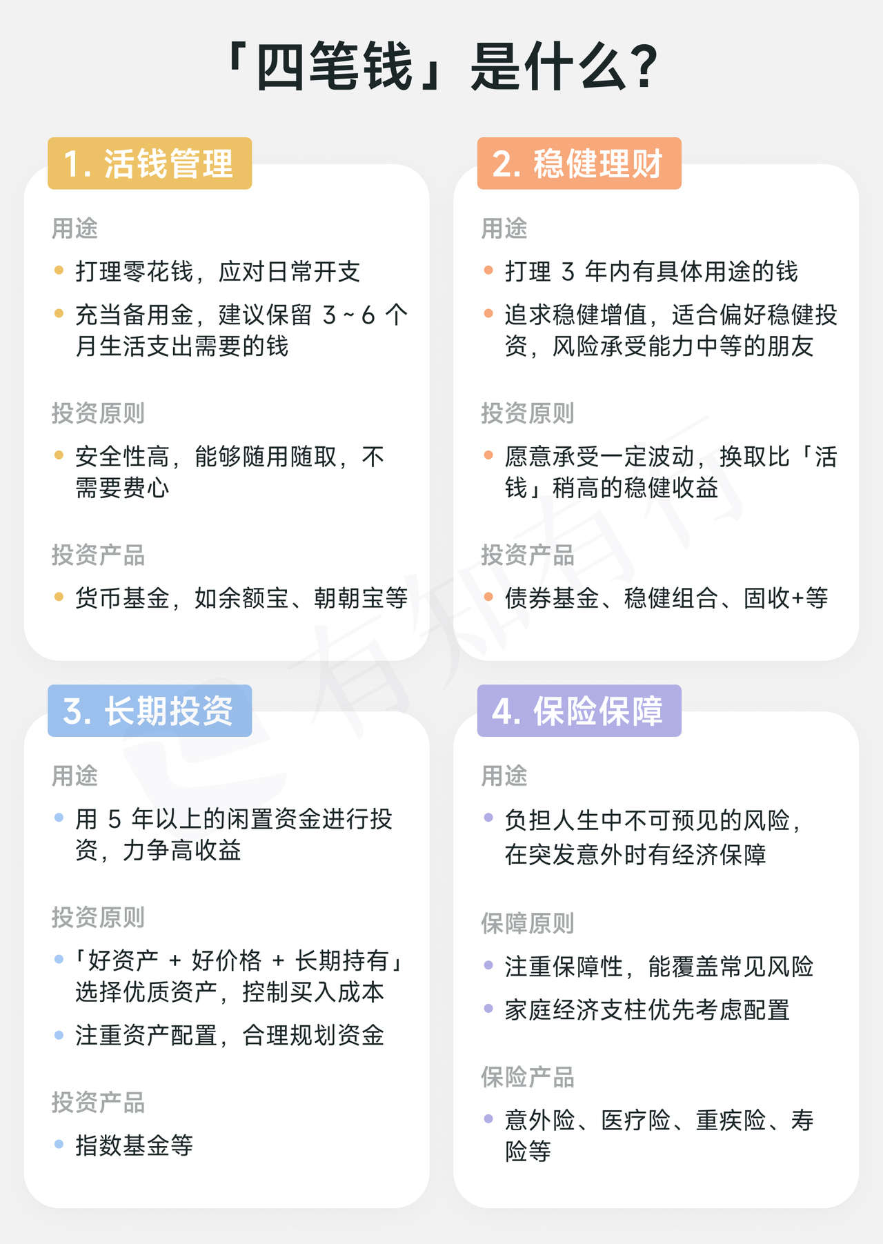 四笔钱,可以通过分账户的方式,把我们的钱根据不同的用处、目标和风险偏好分开管理,从而搭建一个健全合理的财务系统。