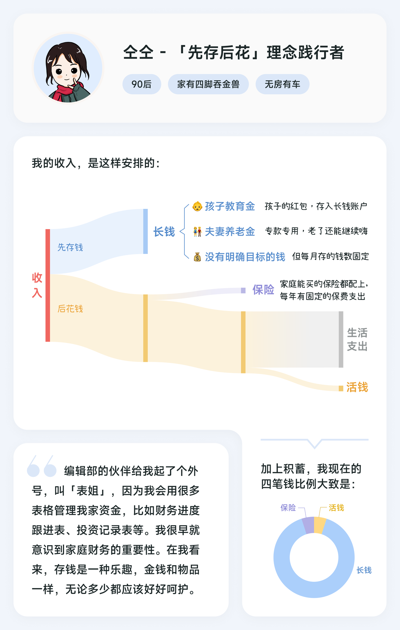 仝仝:理性来说,是我的日常花销不算多以及保险配得比较全。但更多的,是我的个性使然。我不是很能接受一笔钱放在那里不怎么赚钱,我会下意识地认为资金利用率低。我现在的活钱金额是我觉得比较舒服的状态。