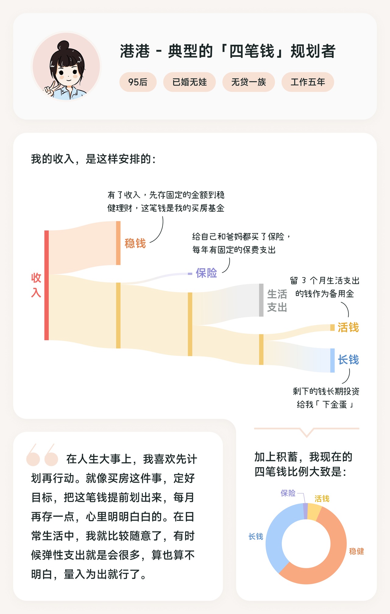 港港:哈哈,首先,我准备买房的那个城市房价没那么高,所以这笔钱可能没有你想象的那么大😂;其次,做计划的时候我就算好了嘛,从积蓄里拿出多少钱,每个月再存多少钱,尽量不影响我现在的生活品质;第三,我老公每个月会给我一笔钱,这也算是我的收入……吧。😁