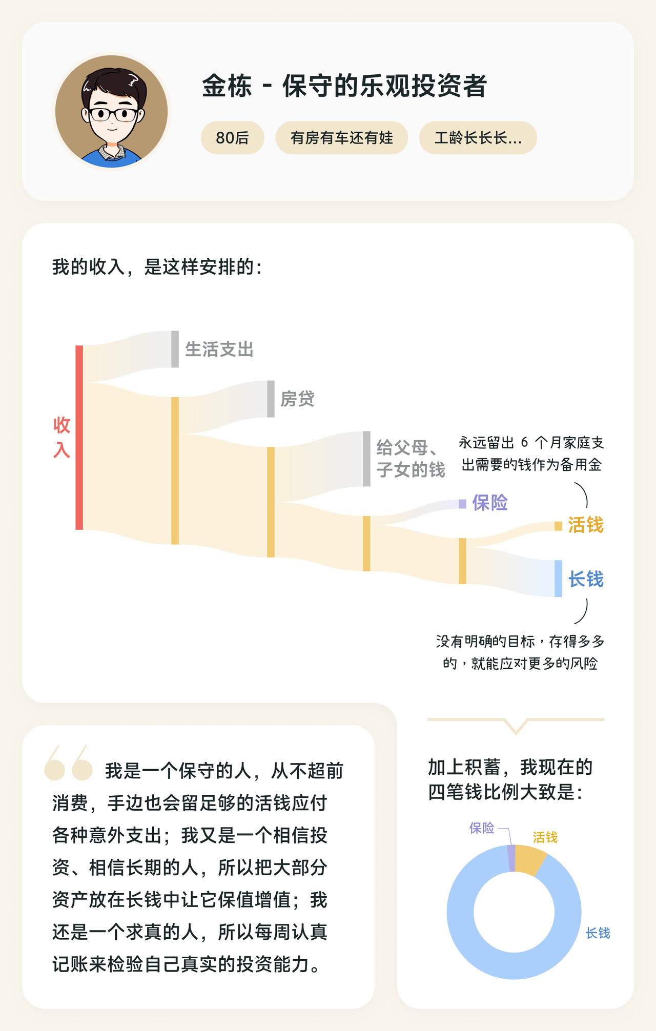 按照小伙伴的思路分析了一下自己的情况,我的四笔钱是这样安排的: 活钱: 充当工资蓄水池和流动中转站,平时有进账会先流入这里,当金额大于三个月生活费后,多余部分转入稳健理财。 稳健: 由于没有两三年内计划使用的消费,所以我的稳健理财主要用于应付意外大笔开支,以及充当加仓用的后备弹药库。 长钱: 我的人生阶段处于前中期,风险承受能力较强,因此这部分长期投资的钱几乎满仓股权资产,最大限度拉高长期收益率。 保险:配备了基本险种,每年固定保费支出。