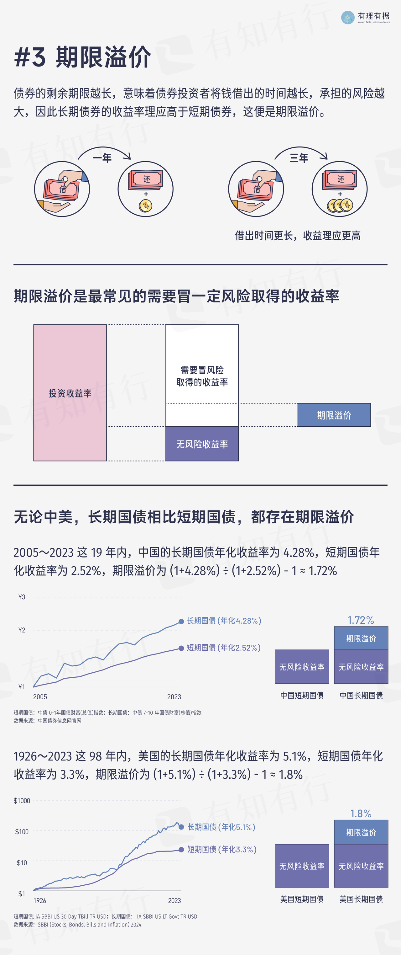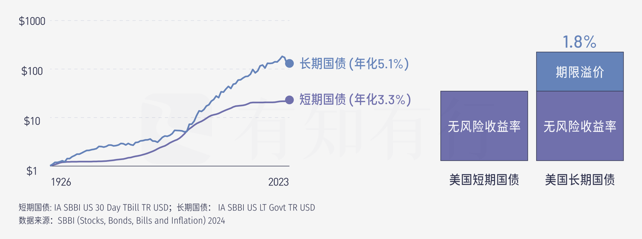1926 - 2023 年,美国的短期国债年化收益率为 3.3%,美国的长期国债年化收益率为 5.1%,同样存在期限溢价。